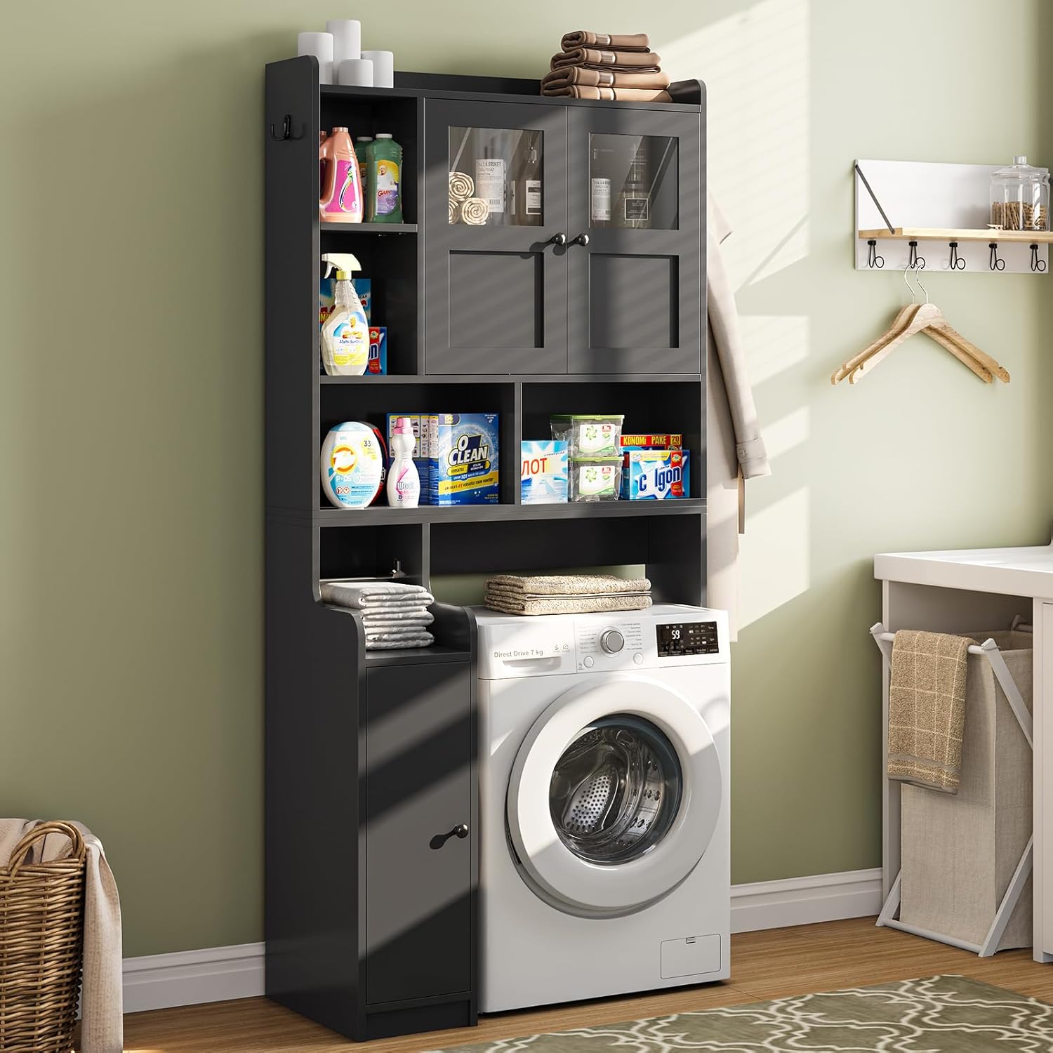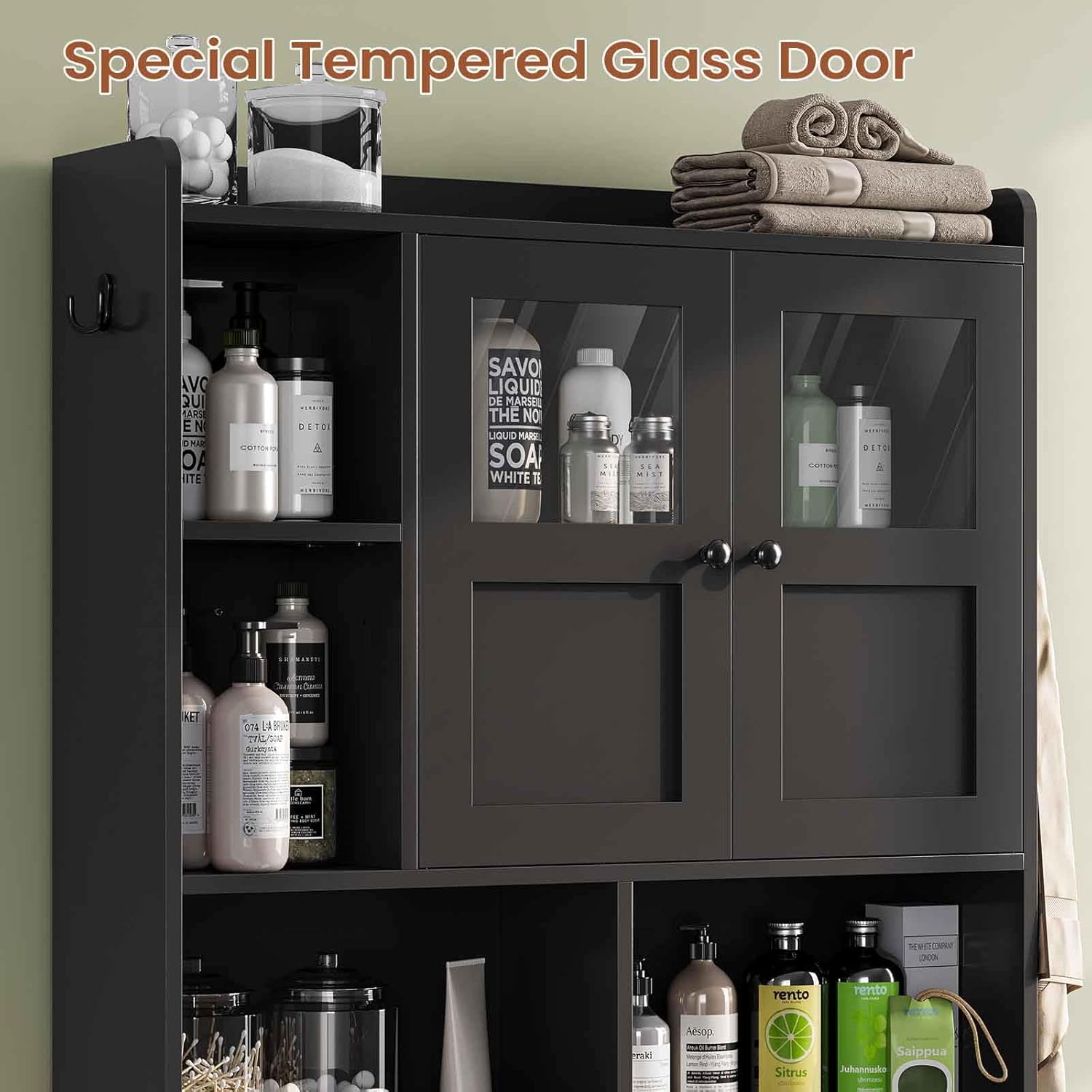 Itaar Over The Toilet Storage Cabinet, Over Toilet Bathroom Organizer with Glass Doors & Toilet Paper Holder Stand, Home Space-Saving Toilet Rack, for Bathroom, Restroom, Laundry(Black)