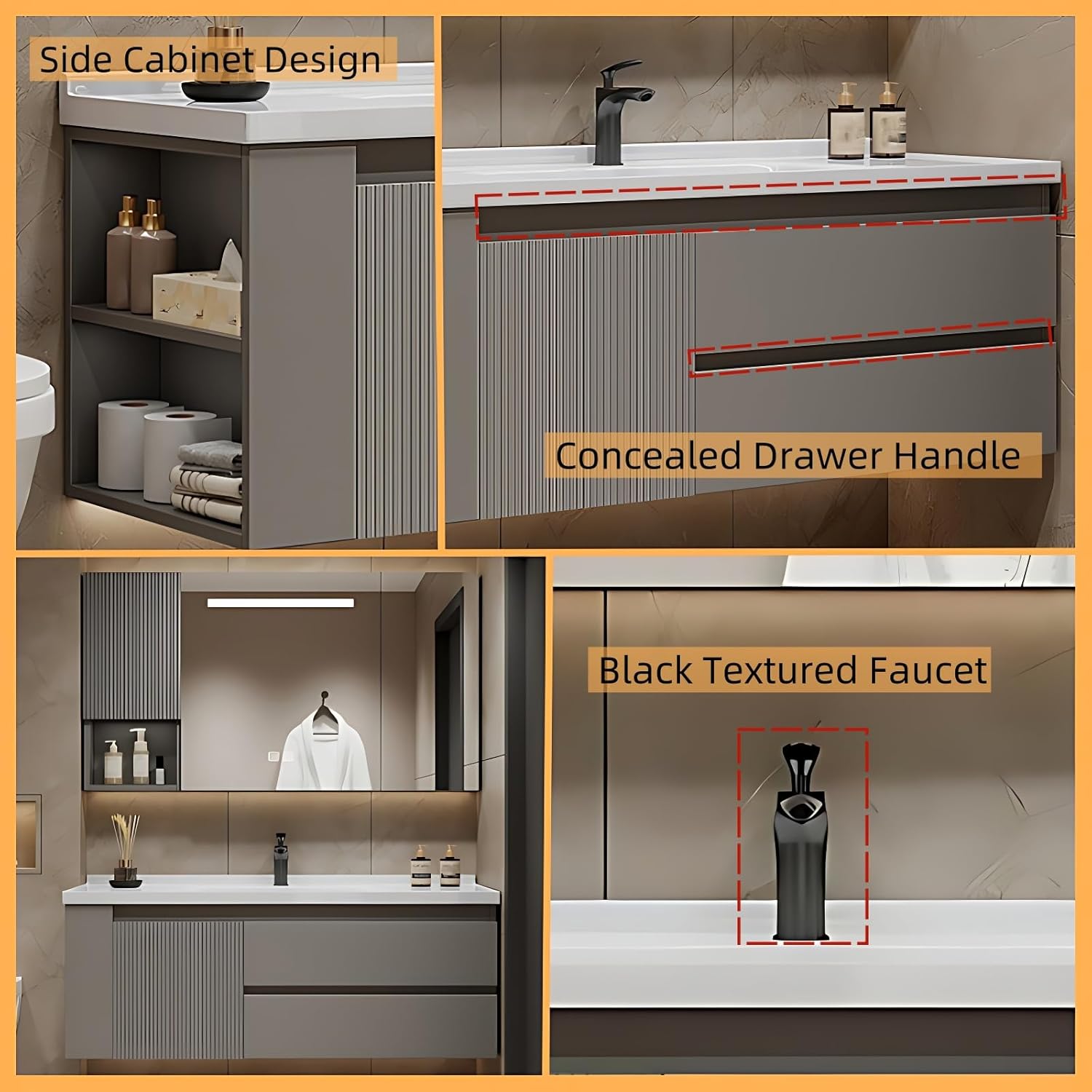 - 【Concealed Drawer Handles】The concealed drawer handle design of our modern bathroom vanity saves space and improves safety, avoiding bumps. It is consistent with the overall style of the bathroom cabinet, showing a simple yet stylish design concept. This handle design is not only beautiful but also practical, making the opening and closing of the drawers smoother and enhancing the user experience