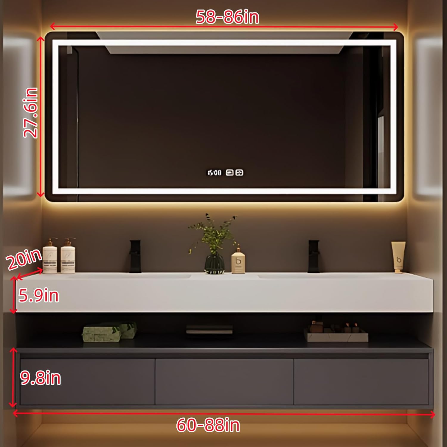 64IN Bathroom Vanity Double Sink - Double Sink Bathroom Vanity Set Include Smart Defogging Bathroom Mirror Cabinet with LED Light Strips, Abundant Storage Space with 3 Drawers (Mirror)