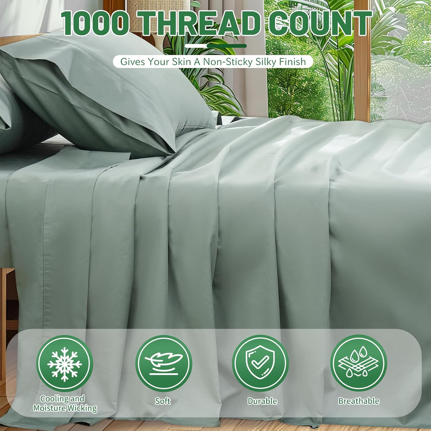 100% Egyptian Cotton Sheets Cal King Sheet Set 1000 Thread Count Sateen Weave Soft Breathable 16-Inch Deep Pocket 4PCS(California King,Sage Green)