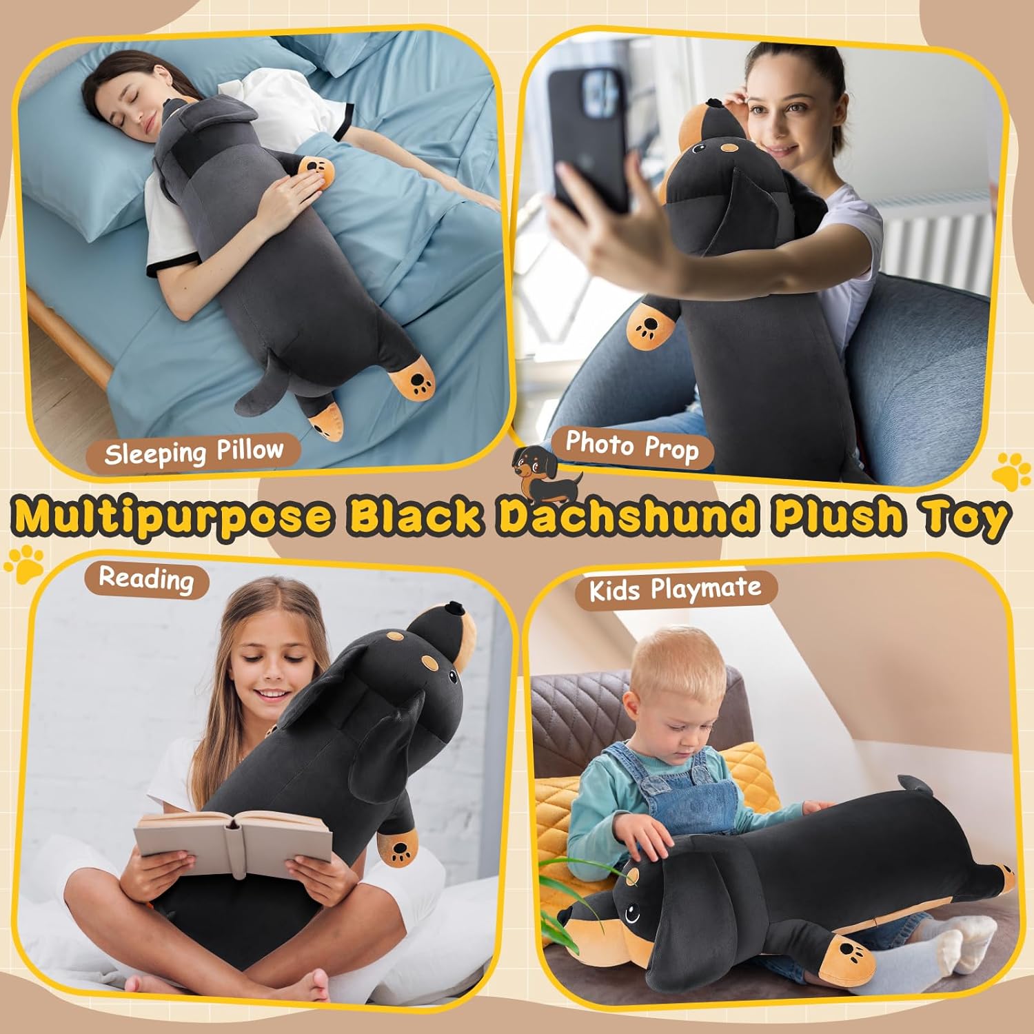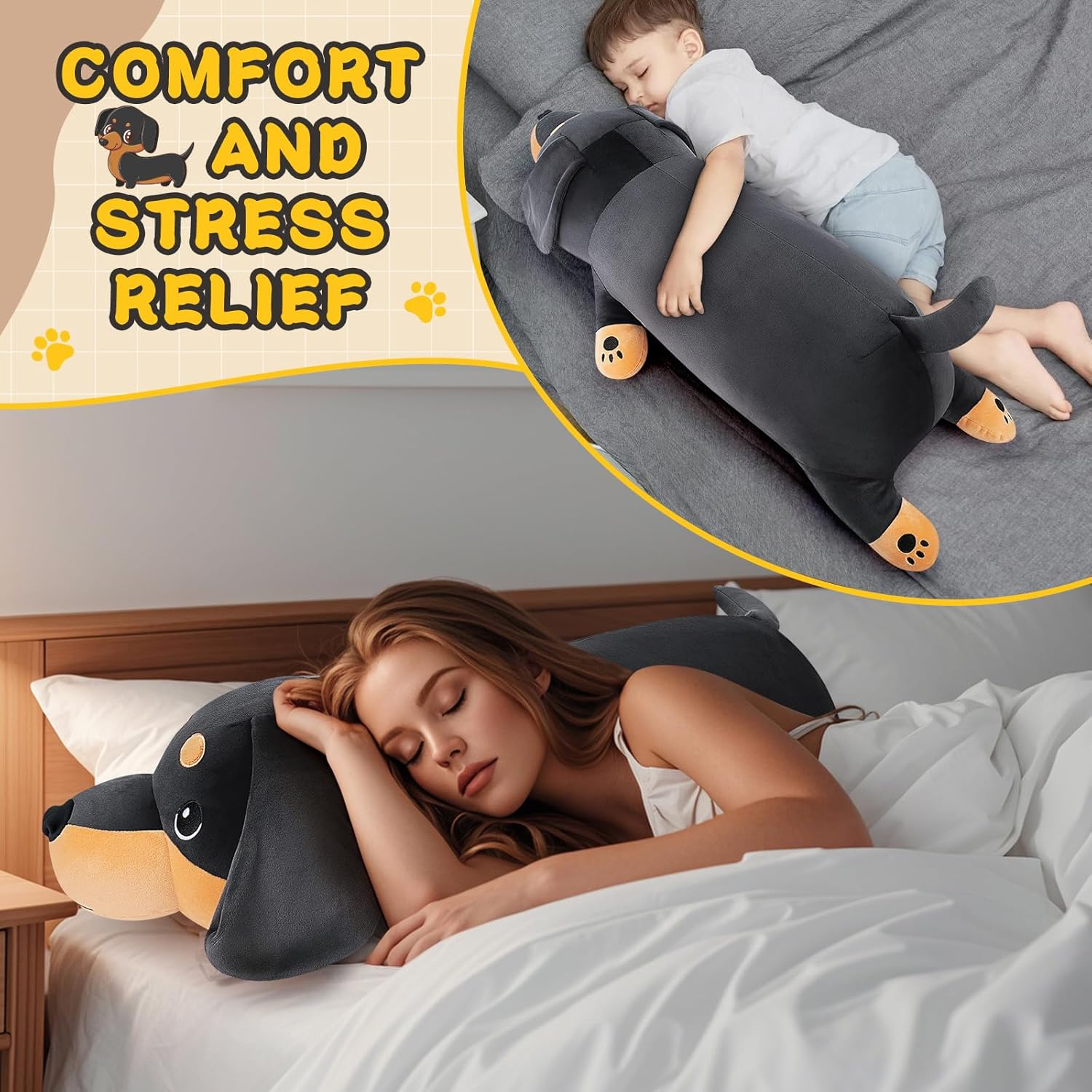- 🎁【Perfect Gift】The kawaii cuddly Dachshund Dog stuffed measures 30", no one can refuse this a delightful present. Embracing this dog stuffed animal helps melt away all bad moods and work stress! It can be used for kids' birthdays, Halloween, Christmas, Valentine's Day, Thanksgiving. It will bring good luck to your family and friends! Why not choose this cute plush to express your concern for your girlfriend, child or friend. your friends, family, and loved ones will love it very much!