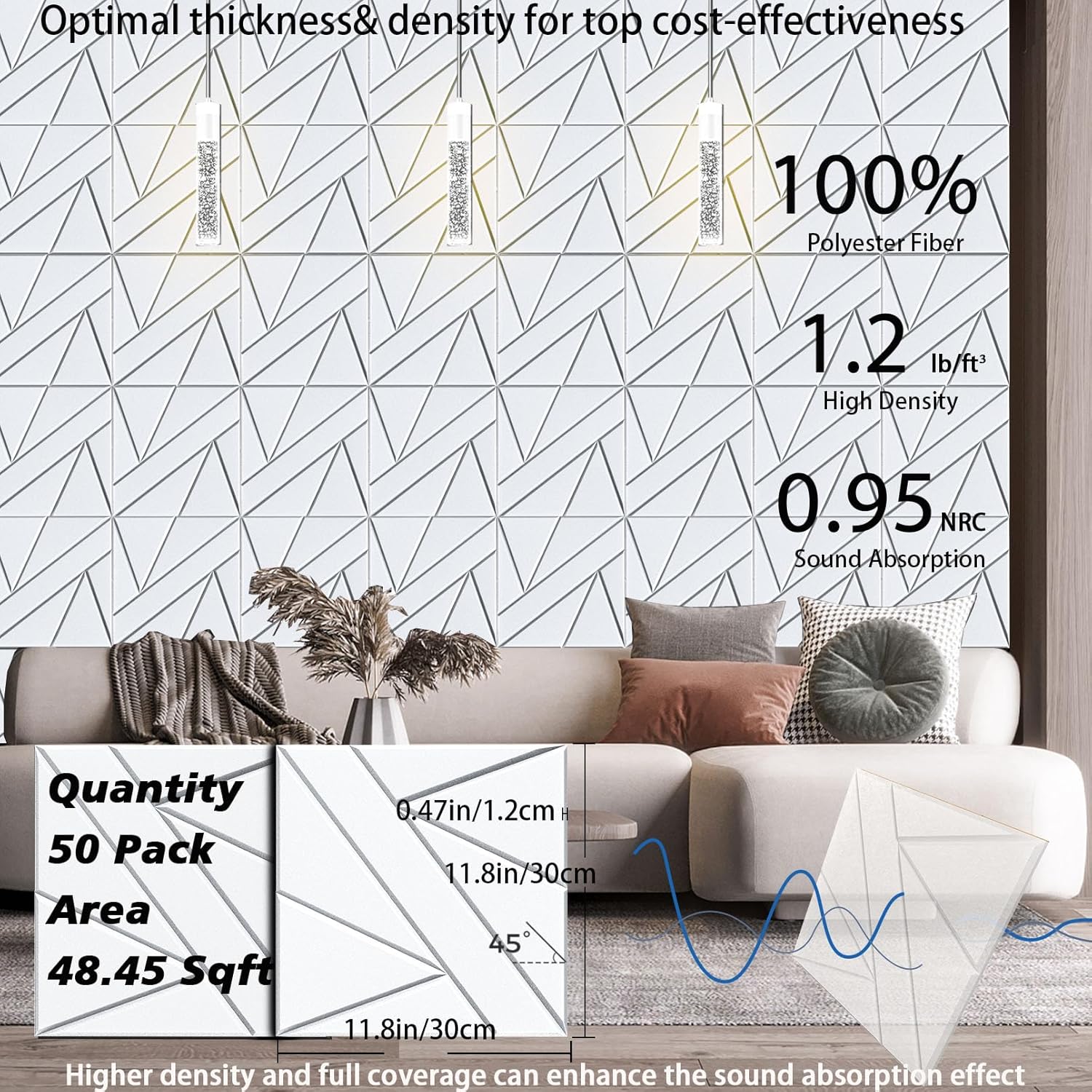 50 Pack Bulk Self-Adhesive Soundproof Wall Panels, 12 x 12 x 0.47 in Sound Proof Foam Panels for Walls, 1.2lb/ft³ High Density, Thicker 0.47in, Acoustic Panels, Duty for Large Walls White