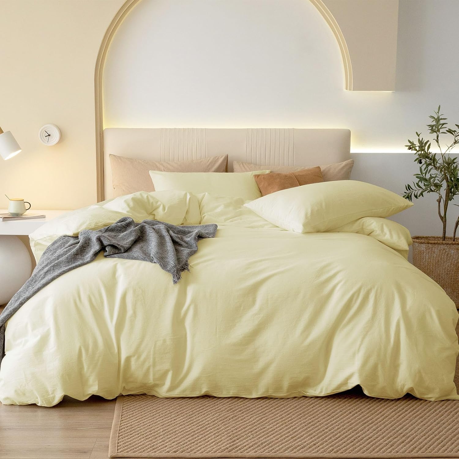JIYUAN 100% Washed Cotton Duvet Cover Set 3 Pieces Full, 1 Duvet Cover 80x90 Inches(Comforter Not Included) and 2 Pillowcases,Linen Feel Bedding Set Comfy and Breathable,Light Yellow