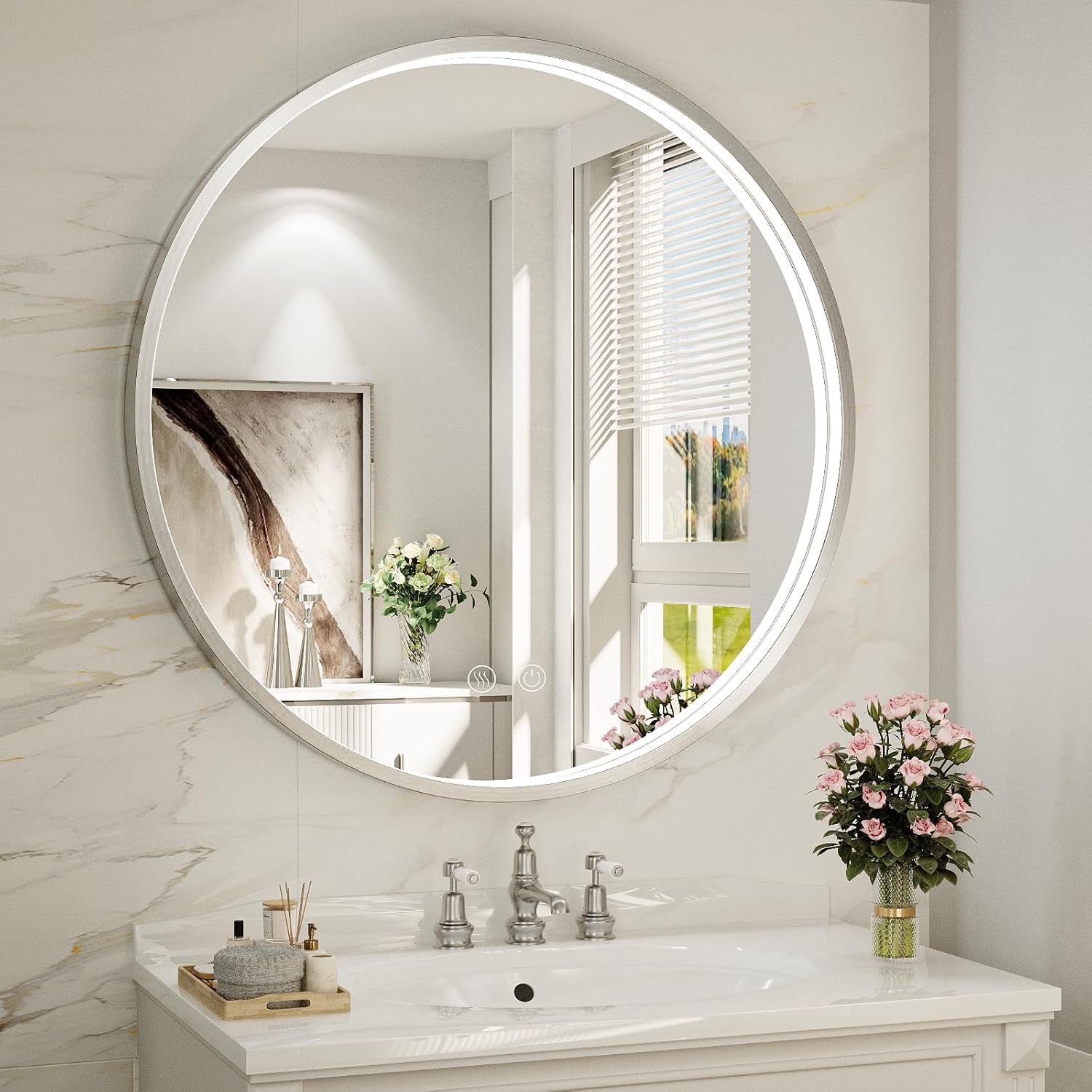 28" Round LED Bathroom Mirror, Dimmable Anti-Fog Vanity Mirror with Touch Control, 6000K Natural Light, Silver Metal Frame, Wall Mounted for Makeup Shaving (IP54, 90+ CRI)