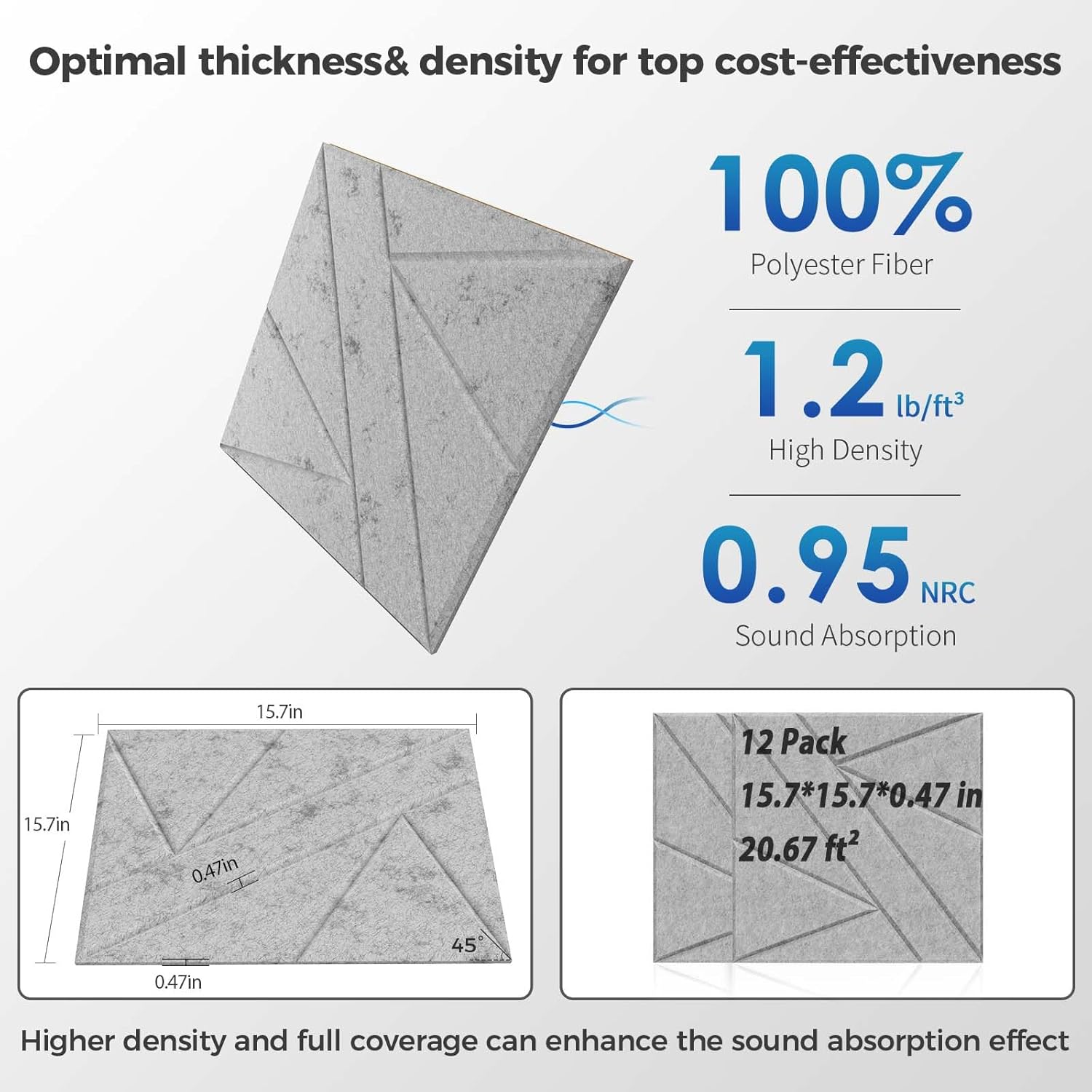 12 Pack Large Self-Adhesive Soundproof Wall Panels, 15.7 x 15.7 x 0.47in Sound Proof Foam Panels for Walls, 1.2lb/ft³ High Density,Large Size Acoustic Panels, Sound Dampening Panels Gray