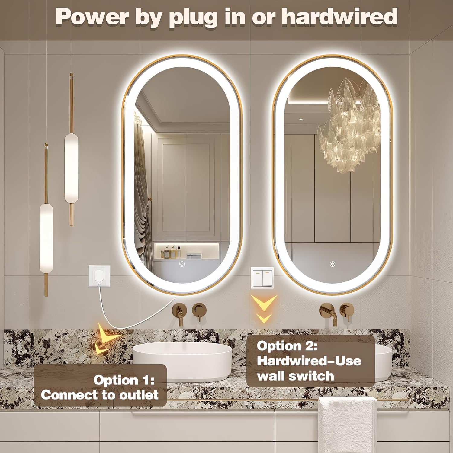 - 【Memory Function and Easy Installation】Our oval mirror has a memory function. When the power is turned off and then restarted, it will return to the previous state of use. The package comes with accessories to hanging the mirror, just reading the instruction carefully. It is easy and safe to install. Each mirror comes with a standard plug that can be plugged into a standard outlet conveniently. Or you can cut the plug, connecting to your switch. Compliance with safety standard and energy saving.