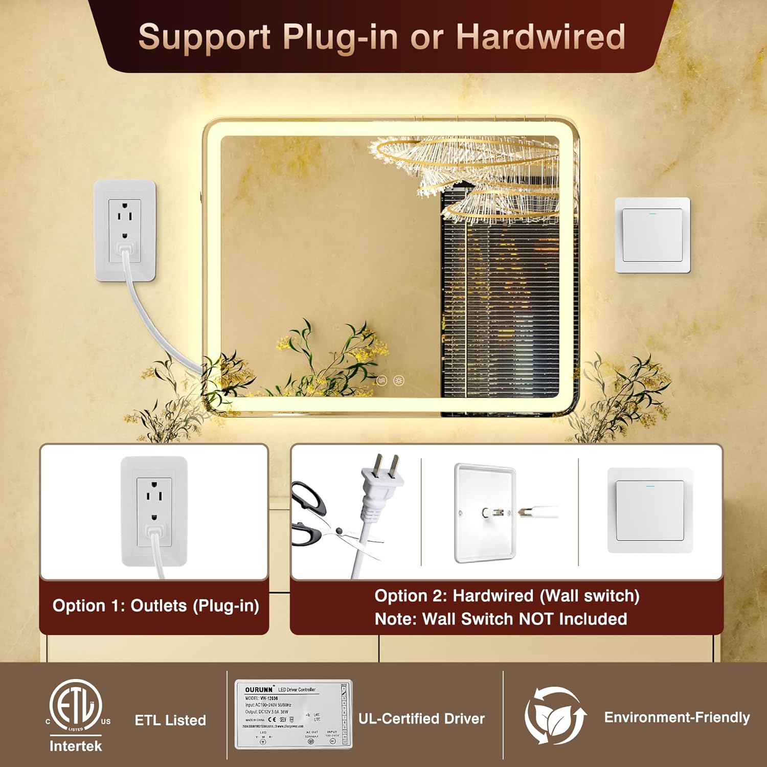 - 【2 Ways to Install & Easy Setup】--- Installation is a breeze with two options available—plug in or hardwired. Simply secure the mirror bracket to the wall using screws, hang the mirror, and choose your preferred power source. For hardwiring, professional assistance is recommended to ensure proper setup.