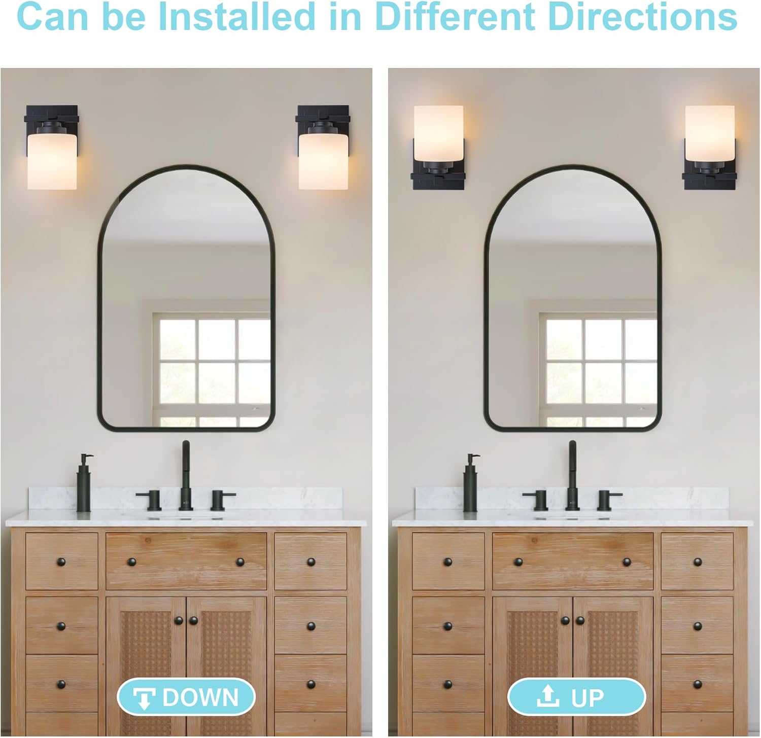 - 【Upgrade Unique Design】 The high quality metal base of black bathroom vanity light, exudes a simple and pure beauty, reflecting a high quality texture. Combined with the milky white glass shade hue, it shows a sophisticated modern style. They are also resistant to rust and corrosion, ensuring their longevity and reliability. Say goodbye to frequent replacements and enjoy the beauty of bathroom lighting fixtures for years to come.