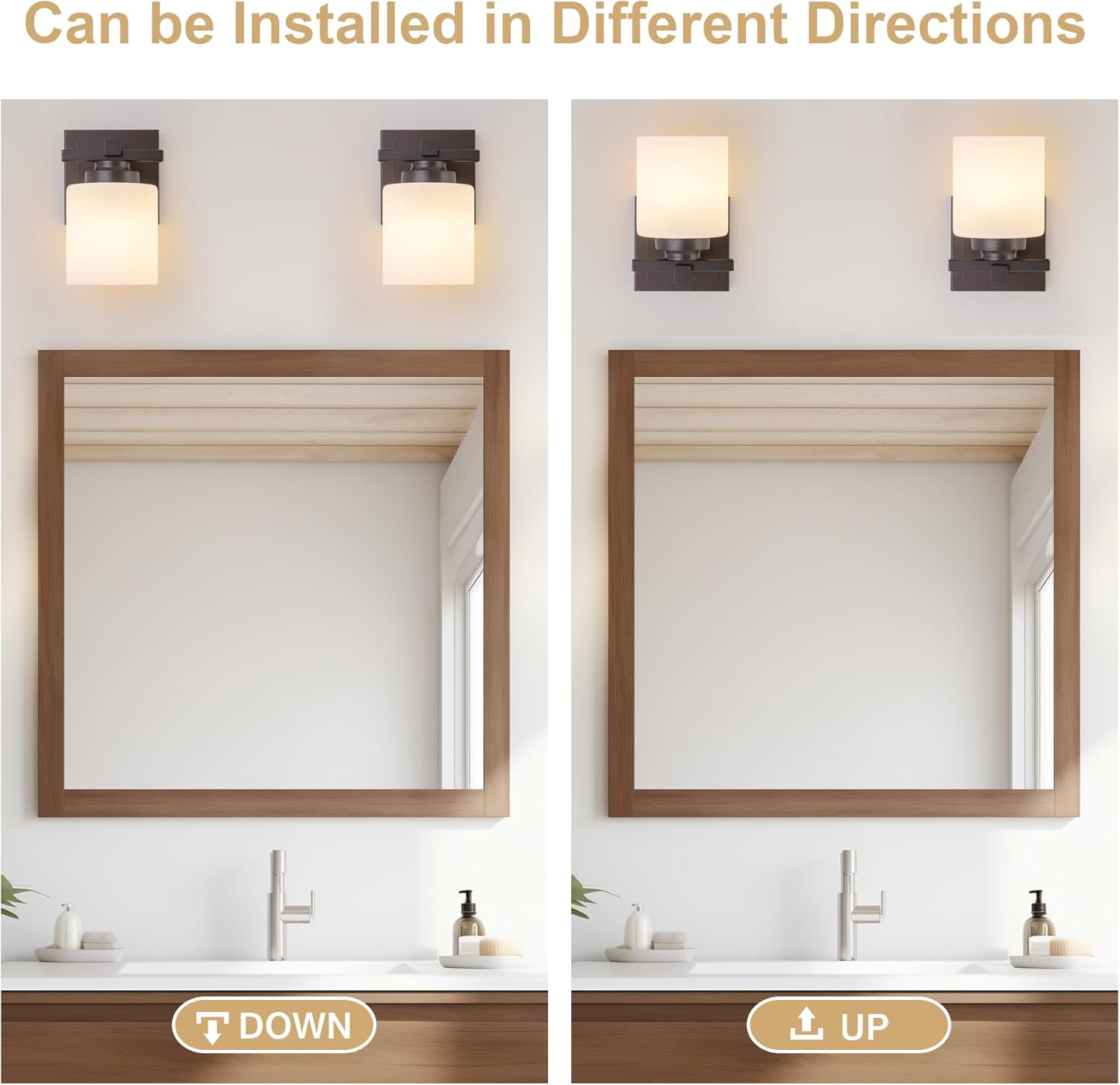 - 【Upgrade Unique Design】 The high quality metal base of oil rubbed bronze finish bathroom vanity light, exudes a simple and pure beauty, reflecting a high quality texture. Combined with the milky white glass shade hue, it shows a sophisticated modern style. They are also resistant to rust and corrosion, ensuring their longevity and reliability. Say goodbye to frequent replacements and enjoy the beauty of bathroom lighting fixtures for years to come.