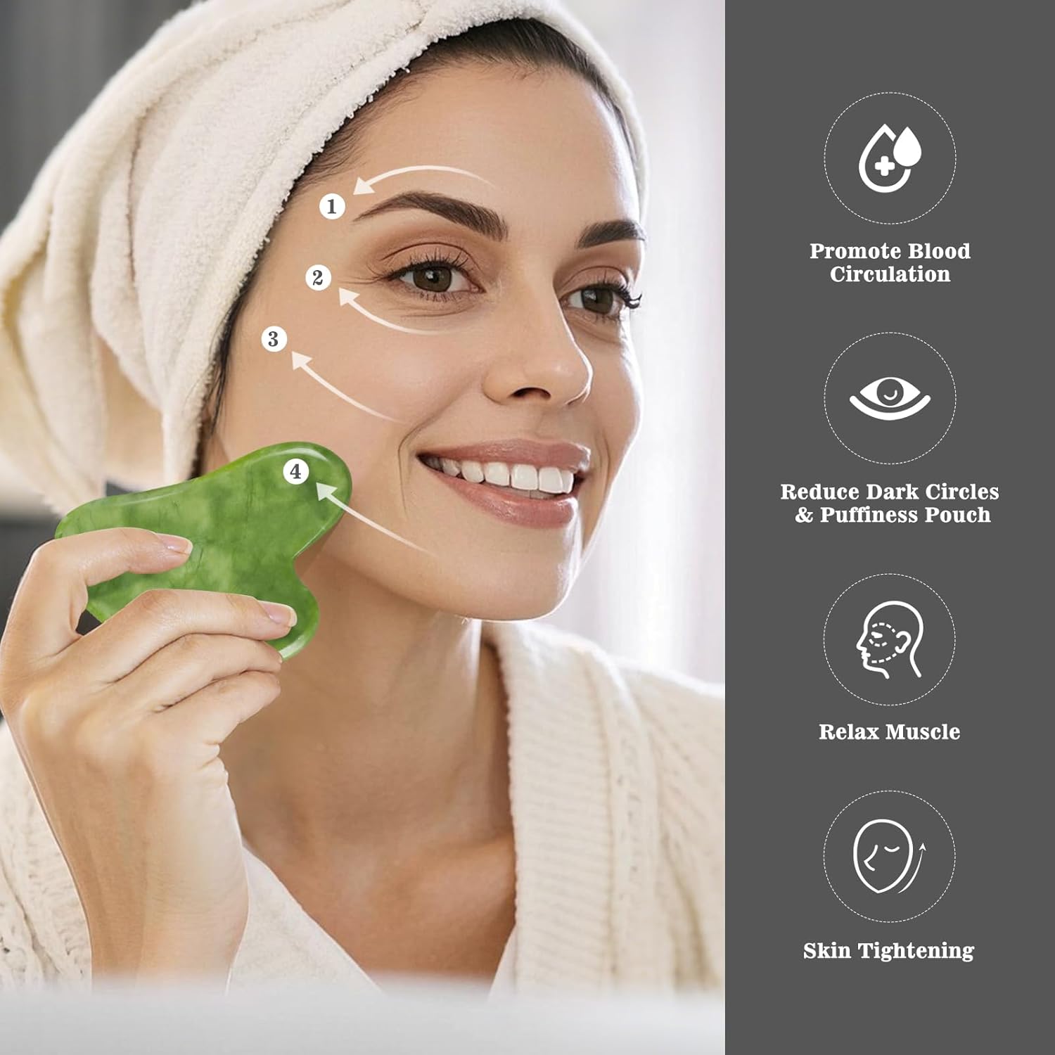 - HIGH QUALITY MATERIAL: The Large guasha tool set is handcrafted from 100% authentic Jade Gua Sha Stone from Anshan city, Liaoning province. The jade stone is known for promoting balance and good energy which will have a positive effect on your skin