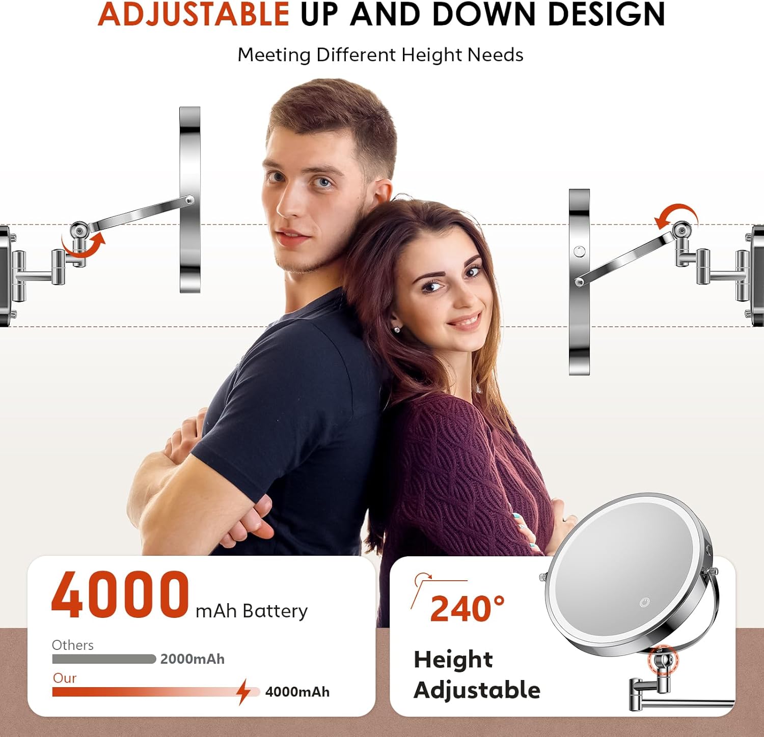 - 4000mAh Rechargeable Cordless Vanity Mirror: Our makeup mirror wall mount is built in 4000mAh rechargeable Lithium battery. Type-C cable and charger is included. No placing batteries needed. Work for more than 12 hours after fully charged, half hours of daily usage, 15 Days of wireless usage. And the lighted makeup mirror with magnification has a 30 mins Auto Light-off Feature to save energy when you forget to turn off the light.【Patent Registered】