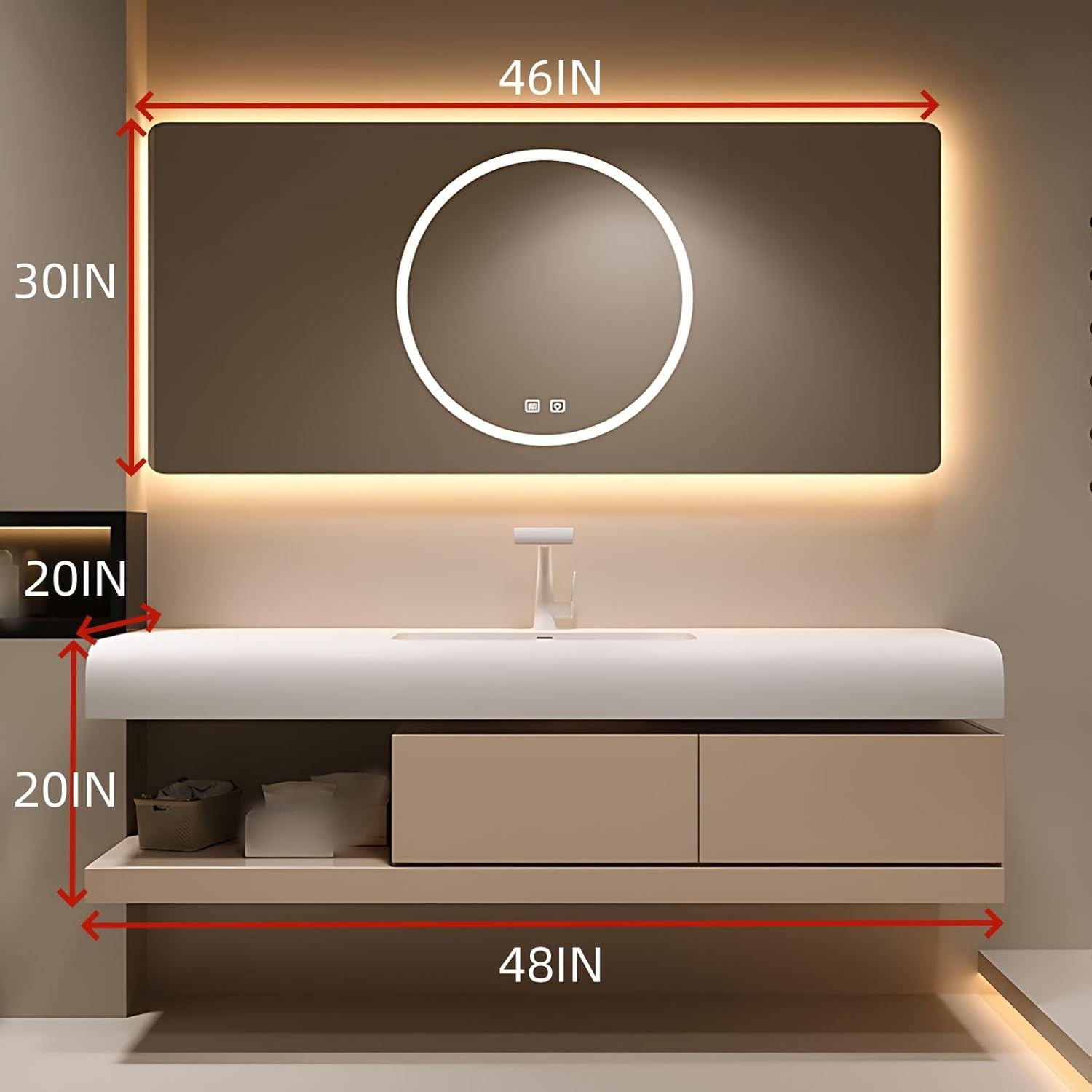 48IN Bathroom Vanity with Sink - Bathroom Cabinet Set has 2 Drawers & Overflow Hole Wall Mounted | LED Practical Defogging Mirror, Open Compartments, Seamless Rock Slab Basin (Khaki)