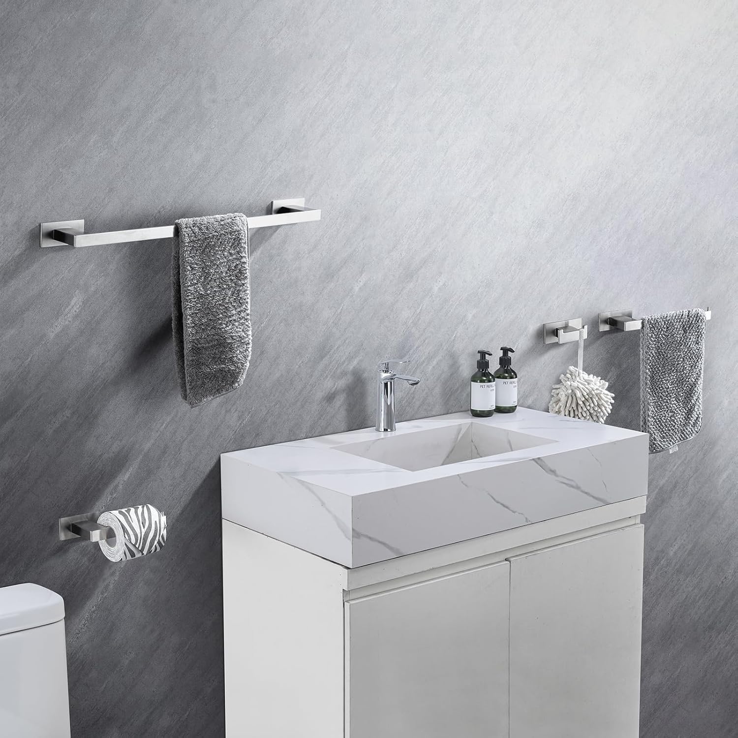 - Wide Range of Applications - 1 towel bar, 1 towel holder, 1 towel hook, 1 toilet paper holder can be installed in any position as needed, suitable for bathroom, toilet, kitchen, living room, bedroom, balcony, etc.