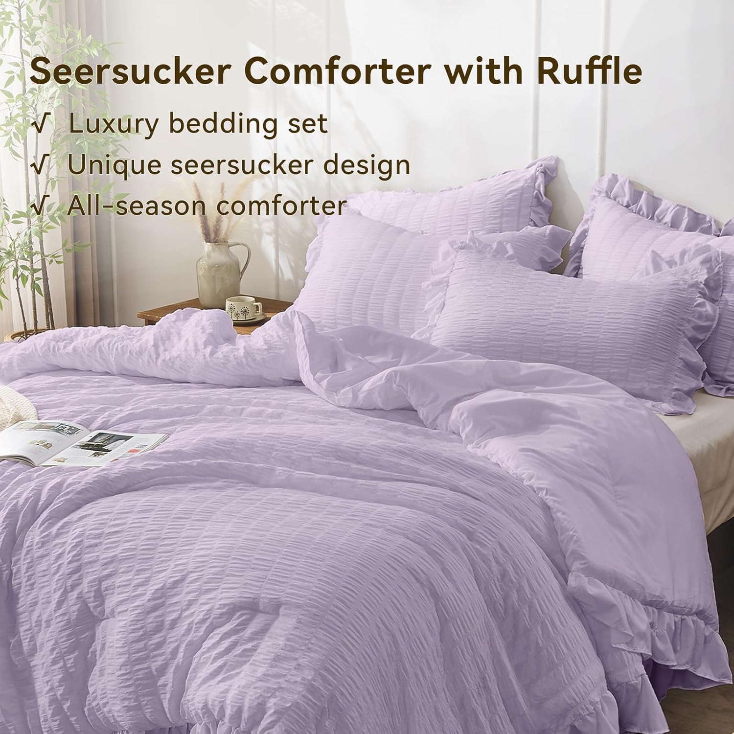 JOLLYVOGUE Lavender King Comforter Set, 3 Pieces Seersucker Comforters King Size, Lightweight & Fluffy Bedding Sets King for All Season with 1 Ruffle Comforter and 2 Ruffle Pillowshams