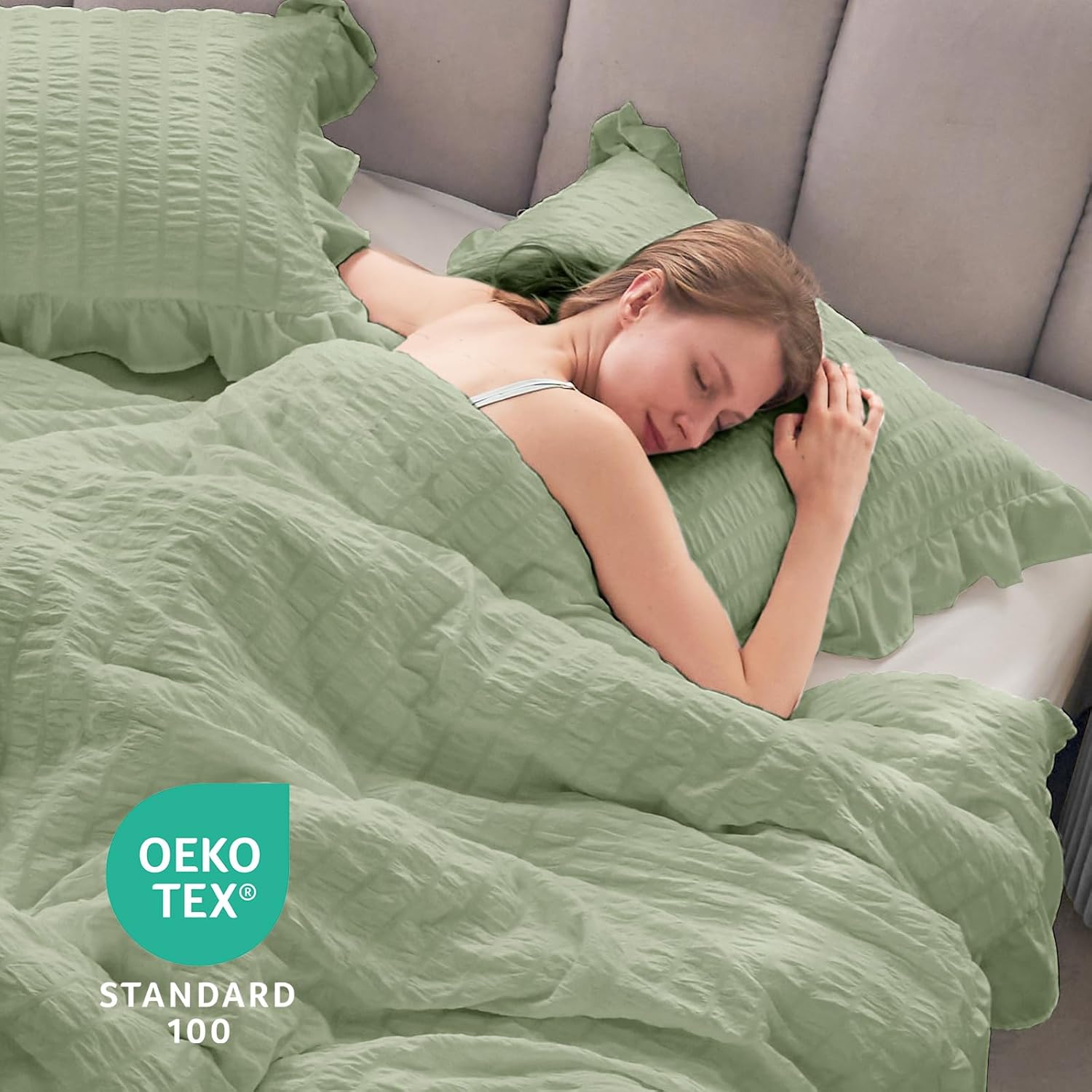 JOLLYVOGUE Sage Green King Comforter Set, 3 Pieces Seersucker Comforters King Size, Lightweight & Fluffy Bedding Sets King for All Season with 1 Ruffle Comforter and 2 Ruffle Pillowshams