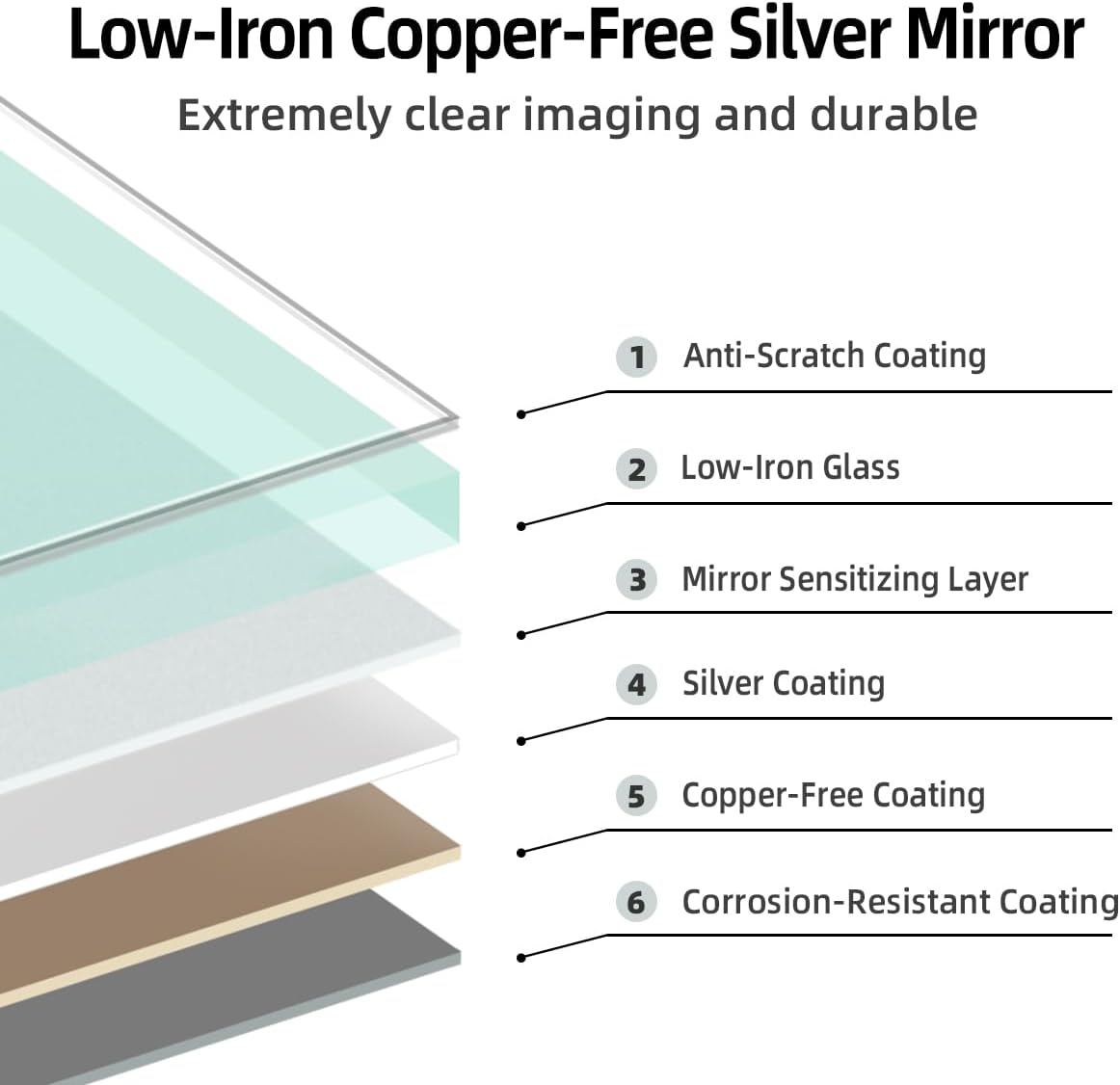 - 【Low-iron, Copper-free Silver Mirror】: nolsia led bathroom mirror is made with 5mm low-iron silver-backed glass that has a reflection rate of up to 98%, providing clear, distortion-free images. It’s processed with Italian-imported equipment, resulting in smooth, even edges. The copper-free silver coating helps prevent rust and extends the mirror’s lifespan. Additionally, the glass is treated to be shatter-resistant for added safety.
