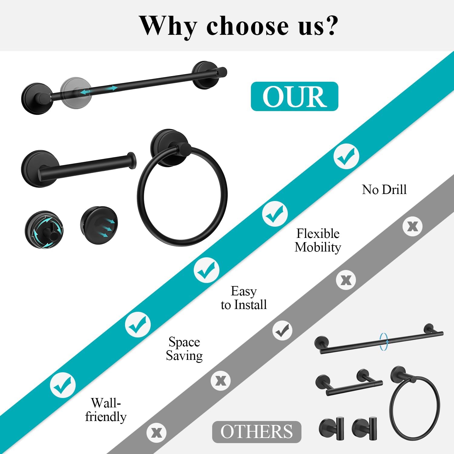 - Suction Cup& No Drilling: Annatuoli 5 piece bathroom accessories set is designed with suction cups, strong adsorption, suction cup towel bar can be firmly affixed to tiles, glass, mirrors and other smooth surfaces, no tools drilling or glue, easy to install without hurting the walls