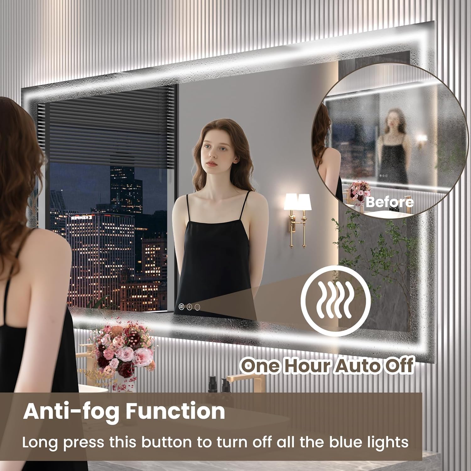 - [Anti-Fog & Memory Function]: Only need a few minutes to get a clear reflection image and keep mirror crystal clear during showers (auto shut-off after 1 hour). Memory function saves your last light settings - no annoying daily adjustments needed