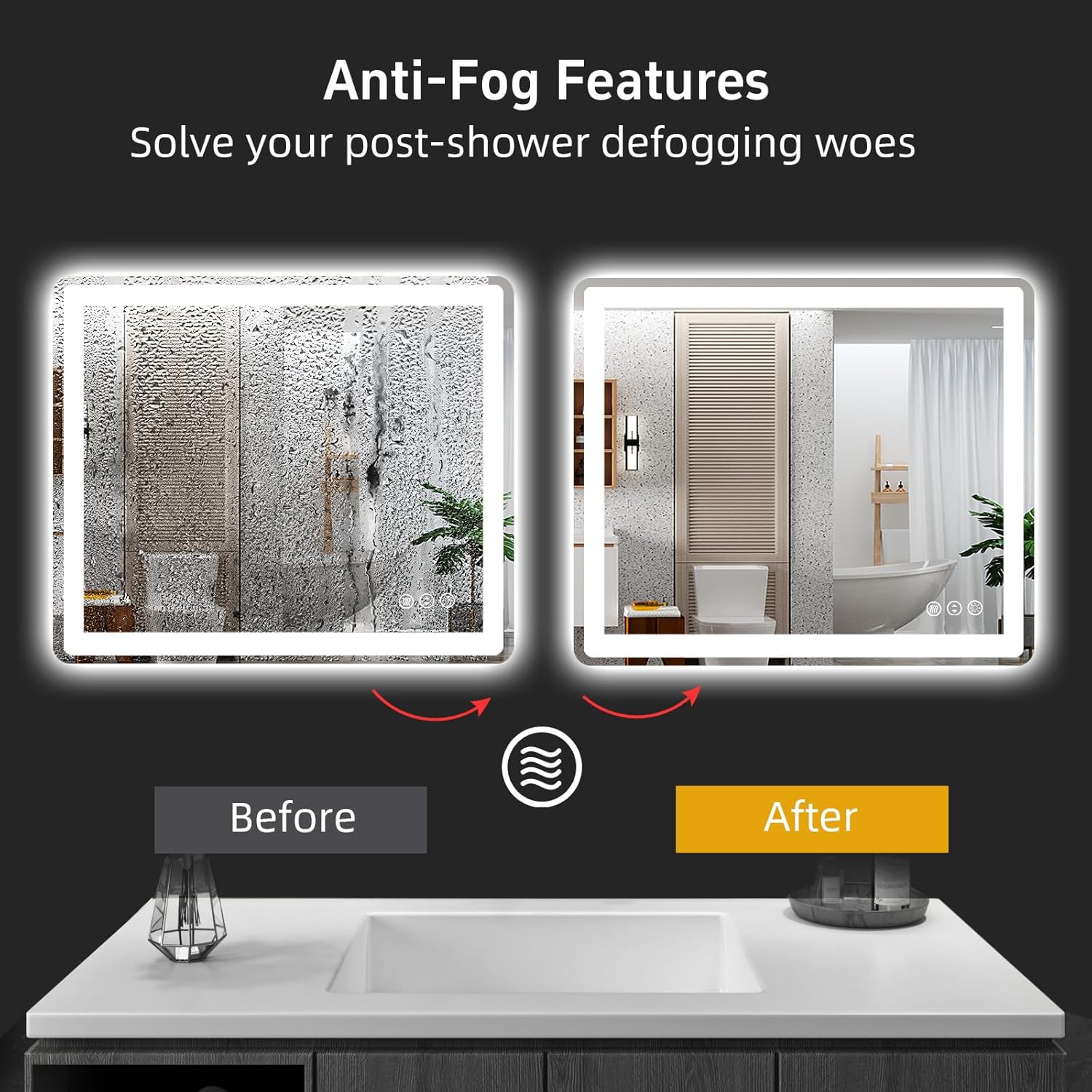 - 【Anti-fog & Clear Reflection】: Smart mirror bathroom with anti-fog coating & a built-in defogger mechanism; The led bathroom vanity mirror will still reflect clearly in the bathroom surrounded by hot air; No bother to wipe the mirror down after a shower; It will turn on with the power on and automatically turns off after 1 hour.