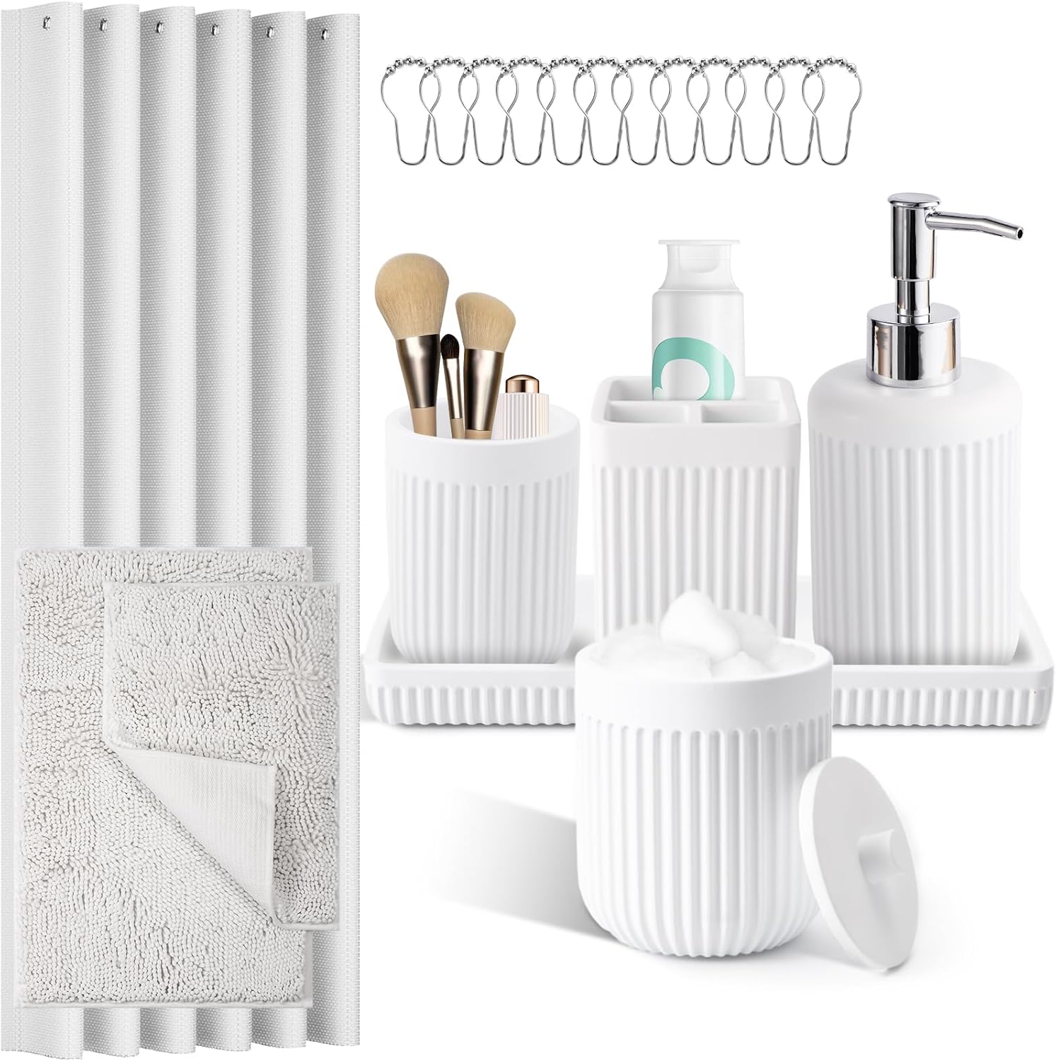 8-Piece White Bathroom Set - Resin Bathroom Accessories Sets Complete with Shower Curtain and Rugs, Soap Dispenser, Toothbrush Holder, Cup, Tray & Cotton Swab Jars