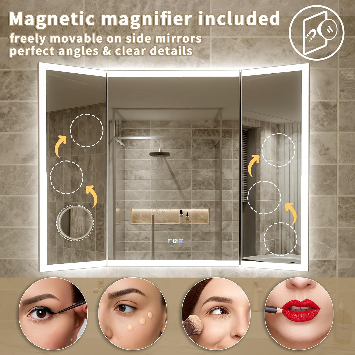 48x36 Trifold Bathroom Mirror with Lights with Removable Magnifier, 180° Foldable LED Mirror for Bathroom, Front&Backlit, Wall Mounted, Stepless Dimming, Color Temper Change, Anti Fog