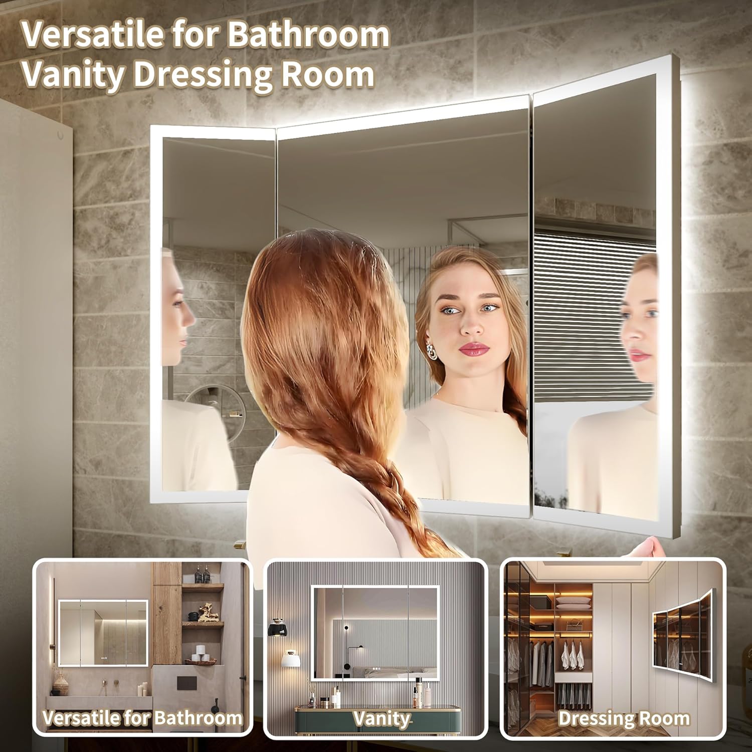 66x36 Trifold Bathroom Mirror with Lights with Removable Magnifier, 180° Foldable LED Mirror for Bathroom, Front&Backlit, Wall Mounted, Stepless Dimming, Color Temper Change, Anti Fog