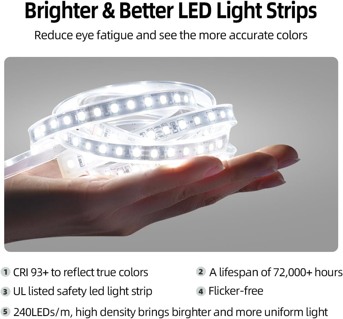 - 【High-Density LED Strip】: Our light strip contains 240 LEDs/m and has a CRI (RA) of 93%, which accurately reproduces colors. It has a UGR<13 rating, meaning it’s gentle on the eyes and flicker-free. The lights last over 72000 hours. And you can select any color temperature from 2700k to 6500k and adjust the brightness from 10% to 100%.