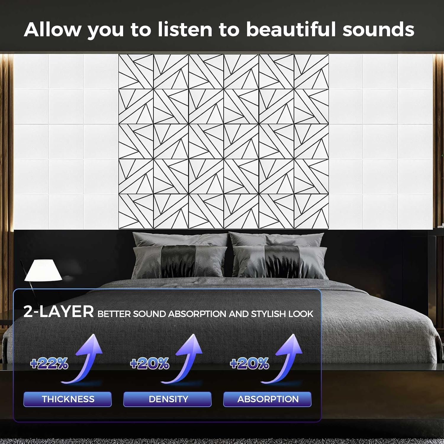 - Excellent Sound Insulation Effect: Our soundproof wall panels has an innovative double-layer structure, providing better sound absorption capacity and decorative effect, especially greatly enhancing the isolation ability of low-frequency noise, which can effectively reduce noise propagation and echo, and provide a quieter environment. Effectively reduces sound reflected from wall, ceiling and floor surfaces, meeting most acoustic treatment needs.