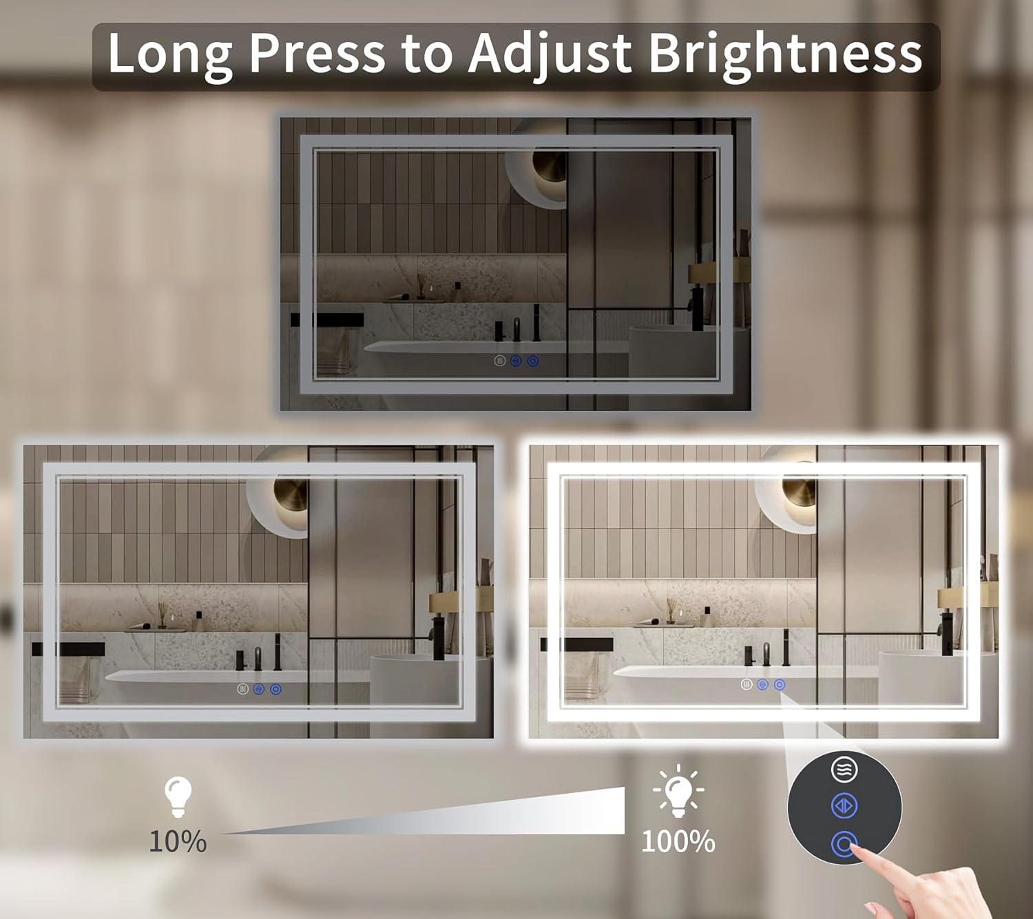 - 【Anti-Fog & Defog, Auto-Off】: Fogless mirror with defog function; No bother to wipe the mirror down after a shower; Anti fog starts quick and one hour auto-off; Turn on the "Anti-fog" function before showering to always maintain a clear reflection. Turn on the "Defog" function after showering to quickly remove steam on the lighted vanity mirror
