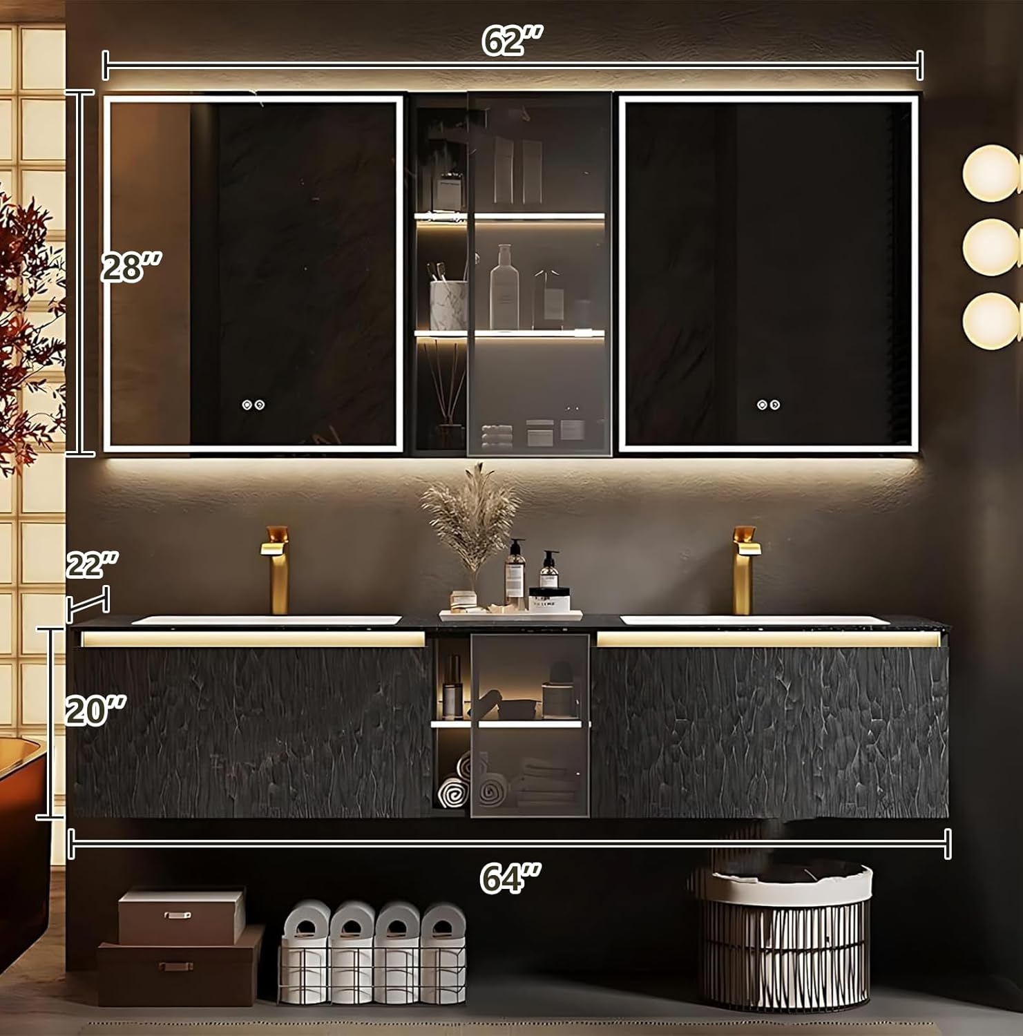 64" Double Bathroom Sink Vanity, Modern Bathroom Vanity Includes LED Smart Defogging Mirror Cabinet & Semi-Open Storage & Ceramic Basin, Floating Bathroom Cabinet with Sensor Light (Charcoal Grey)