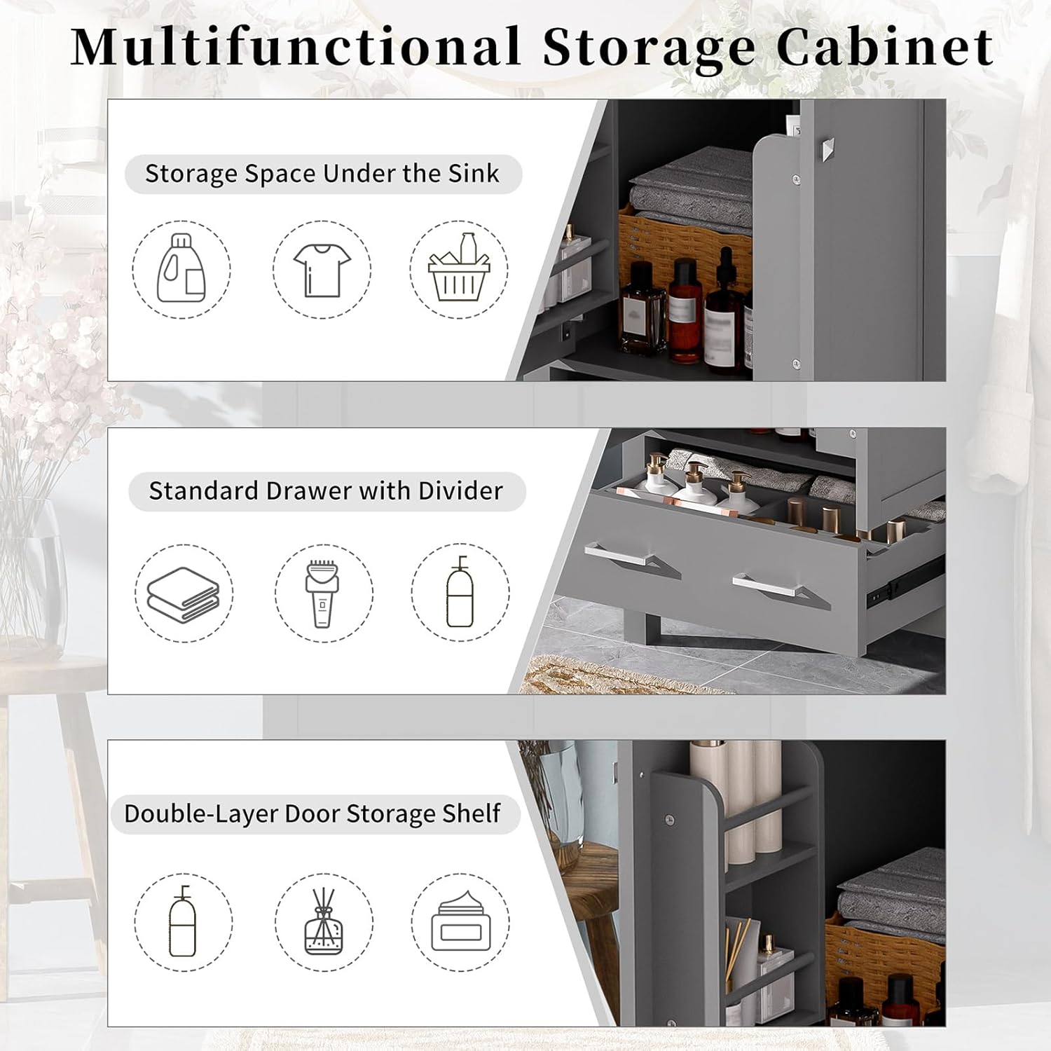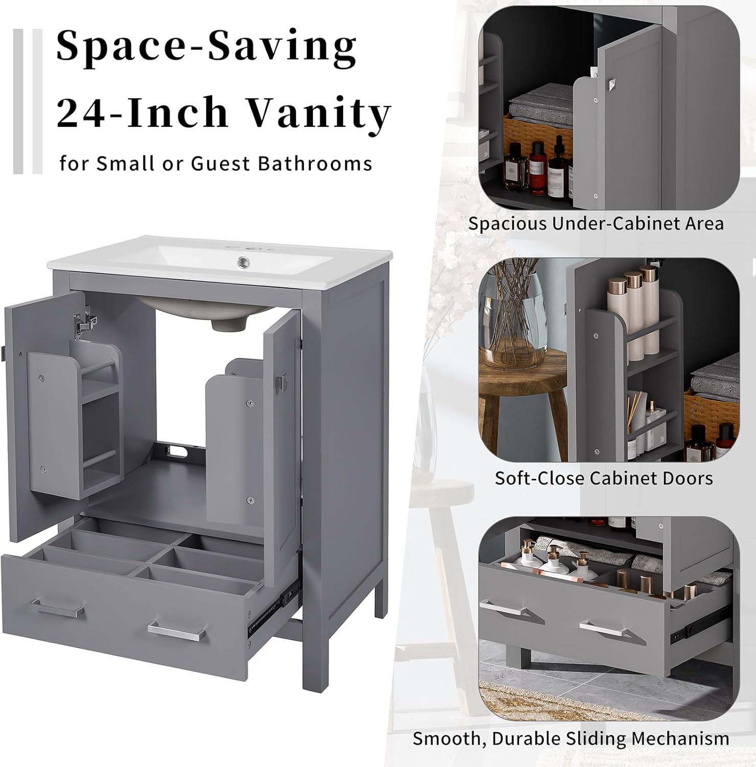 24" Bathroom Vanity with Sink Combo Set, Solid Wood Frame Bathroom Storage Cabinet with 2 Drawers and 1 Drawer, Double-layer Door Shelf, Soft Closing Cabinet Door with Organizer,Grey