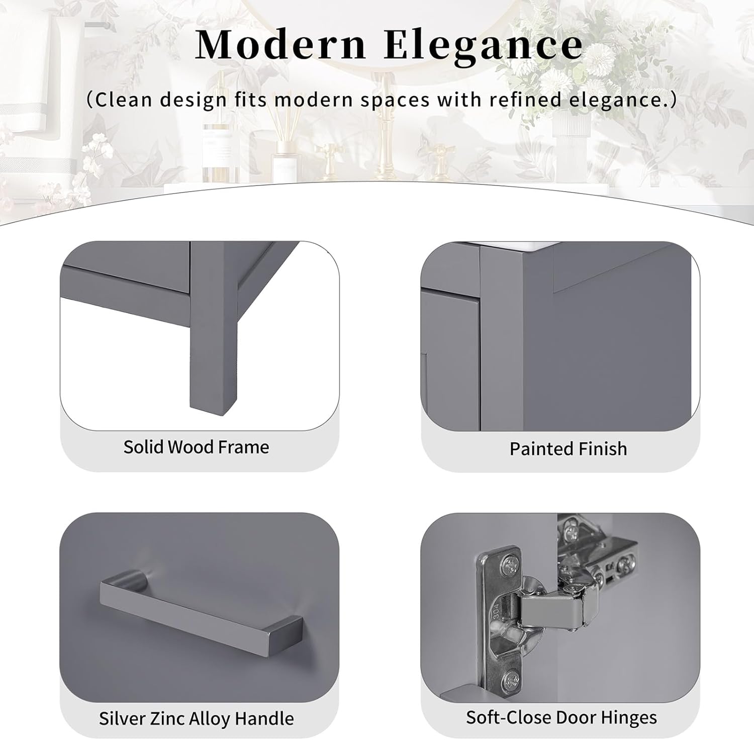 - Unique Craftsmanship: The bathroom vanity smooth and quiet operation of the cushioned door hinges improves safety and user comfort for daily use; Stylish silver handle: The smooth metal handle makes the cabinet opening and closing effortless. The overall touch of the bathroom cabinet is smooth, which enhances the texture and quality.