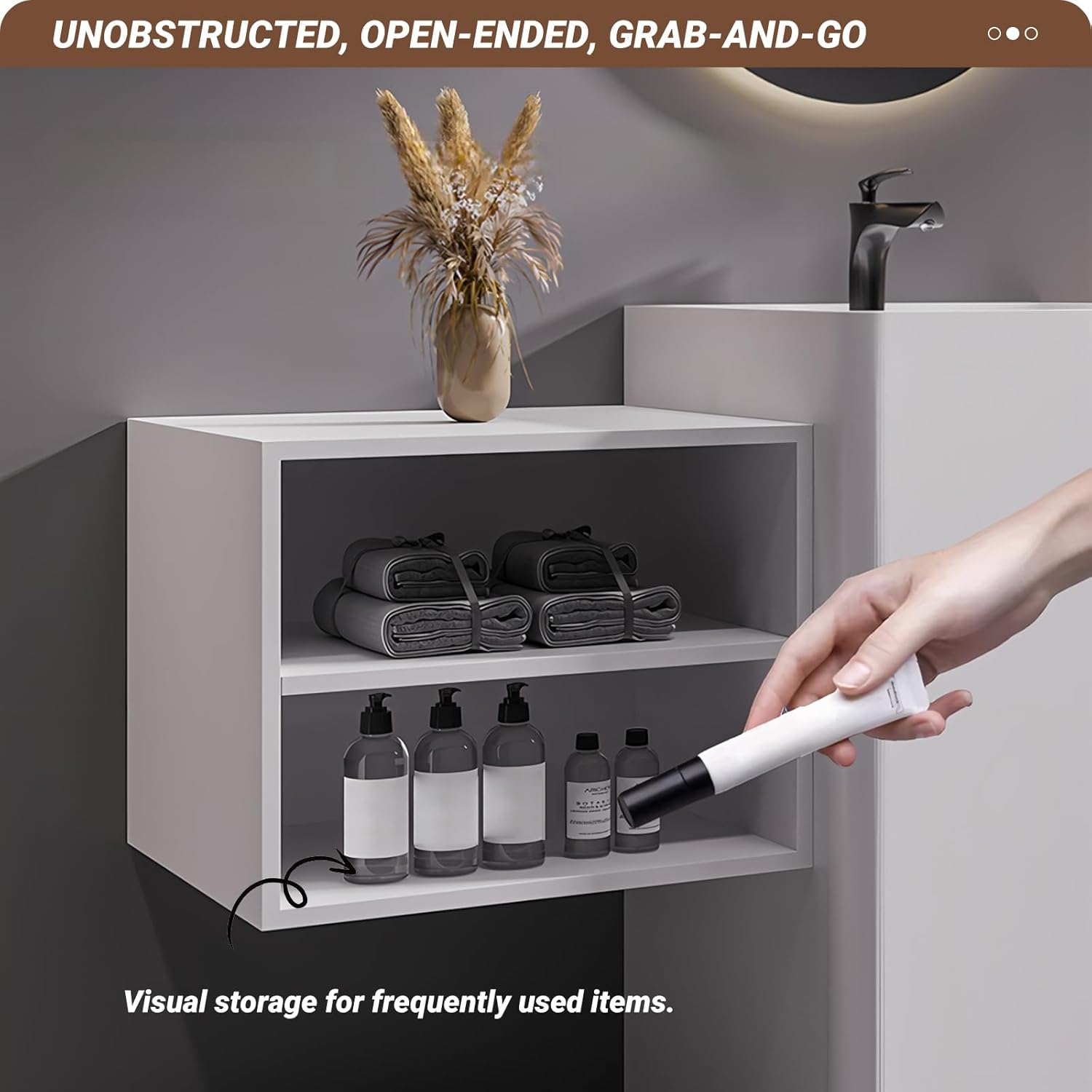 - OPTIMIZE STORAGE SPACE: The bathroom cabinet adopts an upper and lower partition structure, equipped with large drawers and open shelves, to plan the storage space. The drawers are hidden for storage to keep the countertop tidy. The open shelves are convenient for daily access, enhancing the overall organization and aesthetic appeal of the bathroom.