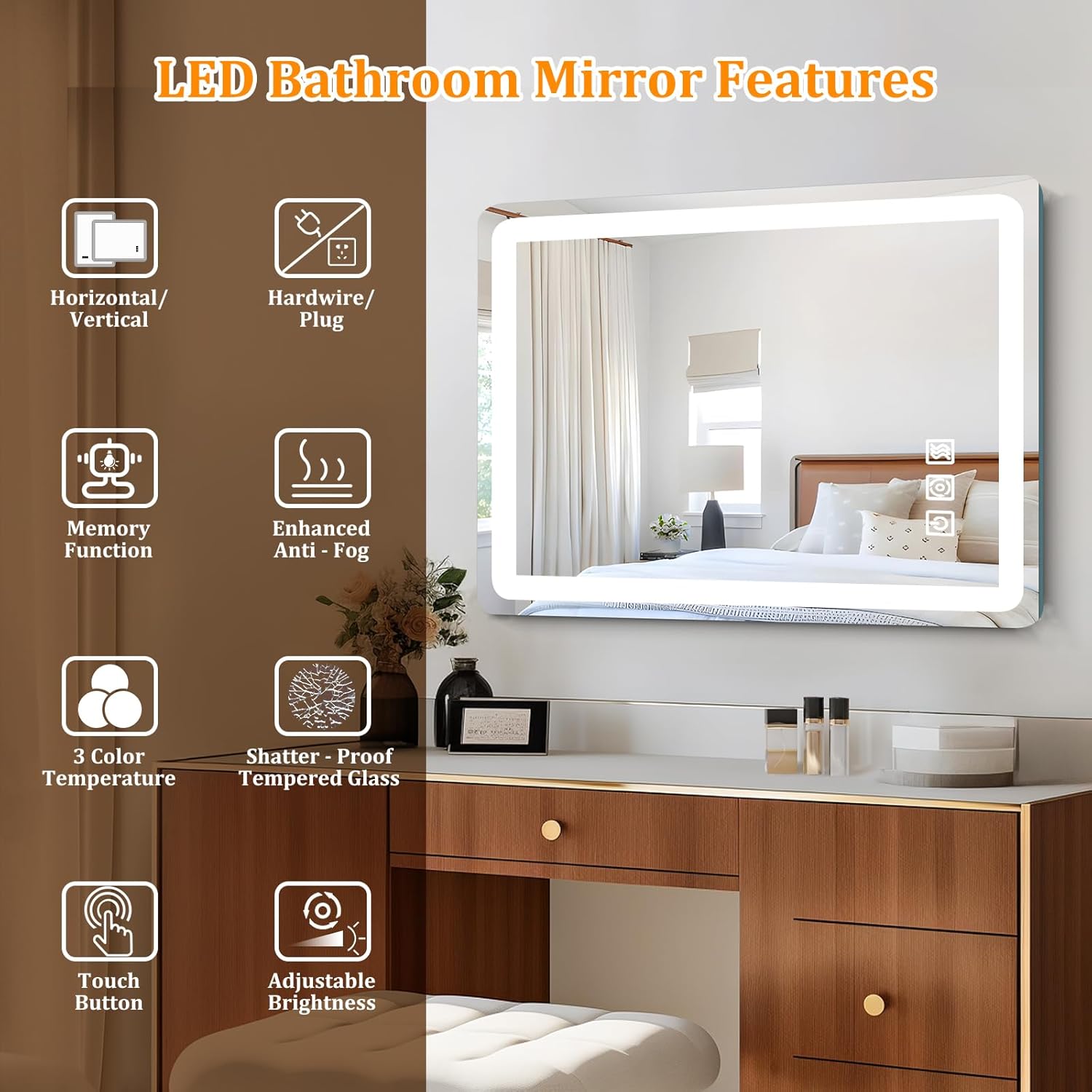 - 【3 Color Temperatures & Stepless Dimming】The wall mounted mirror offers 3 color temps via touch: Warm (3000K), Natural (4000K), White (6500K). Long-press touch control enables 10%-100% stepless dimming. A memory function saves settings, restoring them on next use.