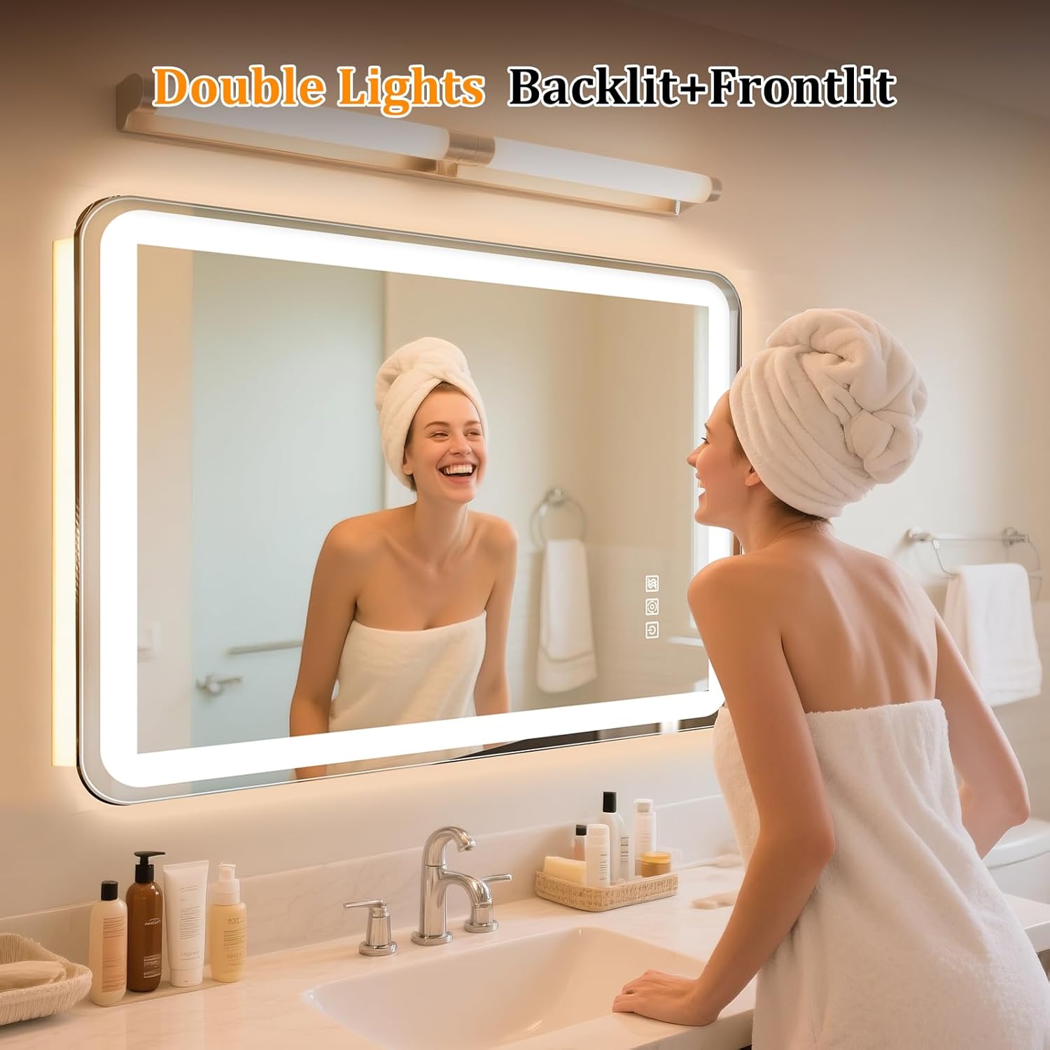 - 【Dual Light Tech: Front & Back】This vanity mirror with lights blends front main light and back ambient light, both shining together. Bathroom mirror has high-quality, waterproof, energy-efficient strips delivering stable, long-lasting, flicker-free light—ideal for makeup, shaving, dressing. Its sleek, modern look perfects bathroom upgrades.