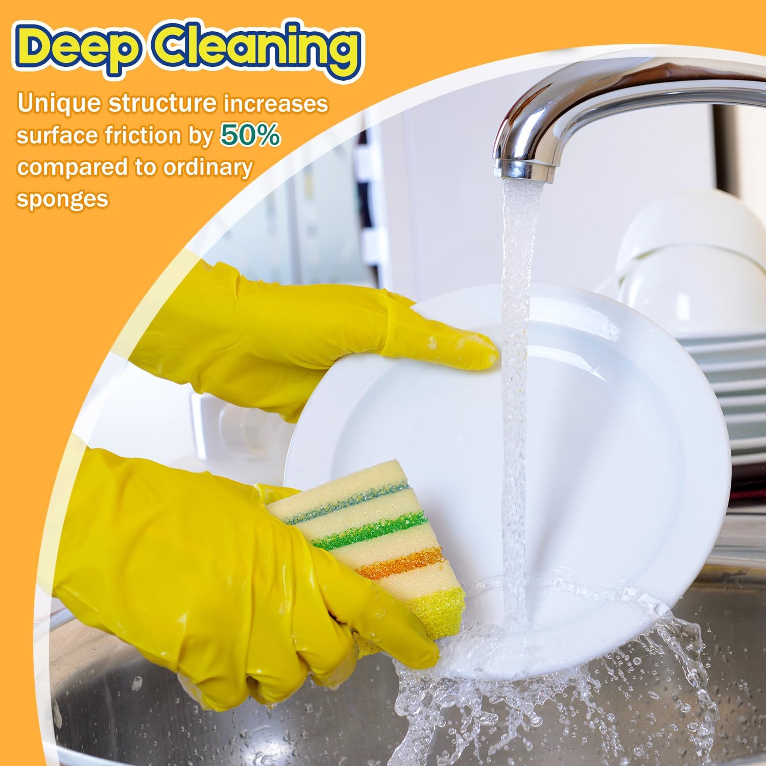 - Patent Pending: Engineered with an alternating cross section layer structure that increases surface friction by 50% compared to ordinary sponges. The raised scrubbing ridges break through grease films and suck into dirt for faster, deeper cleaning. It cuts through tough grease and baked-on food in half the time, making your least favorite chore a breeze.