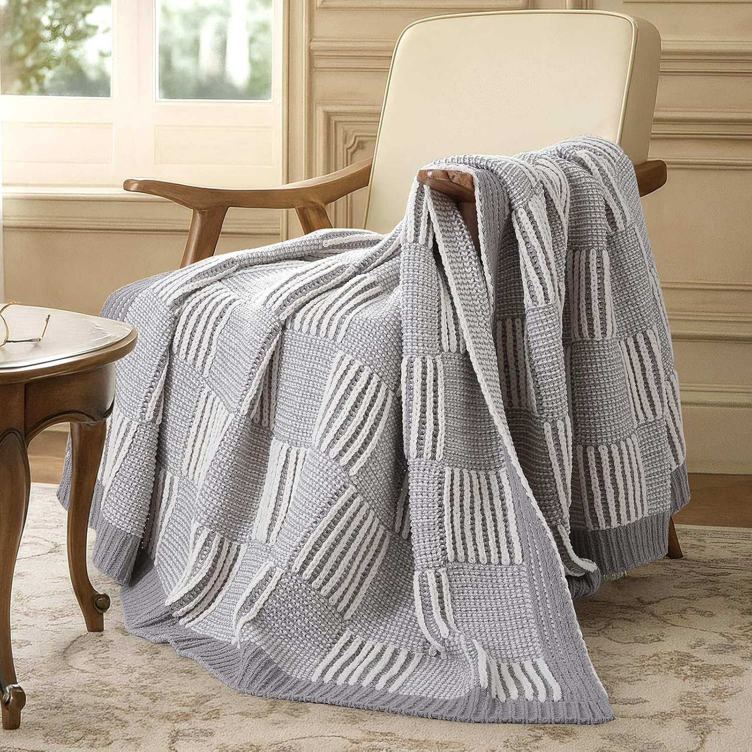 Amélie Home Checkered Knit Throw Blanket for Couch, Chenille Texture Decorative Soft Blanket for Sofa & Chair, 50"x60", Grey & White