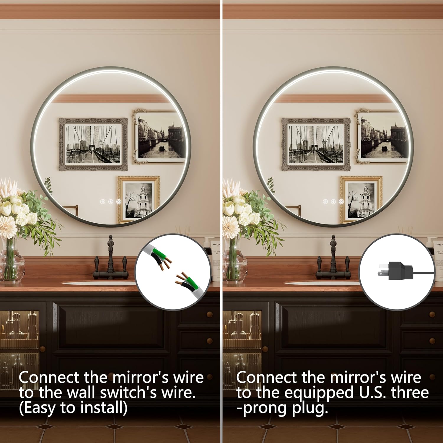 - 🌫️【Smart Anti-Fog Technology】Equipped with an anti-fog feature, this round lighted mirror ensures a clear reflection even after a hot shower, and Auto shuts off after 60 minutes to save energy, enhancing your daily routine without compromising visibility