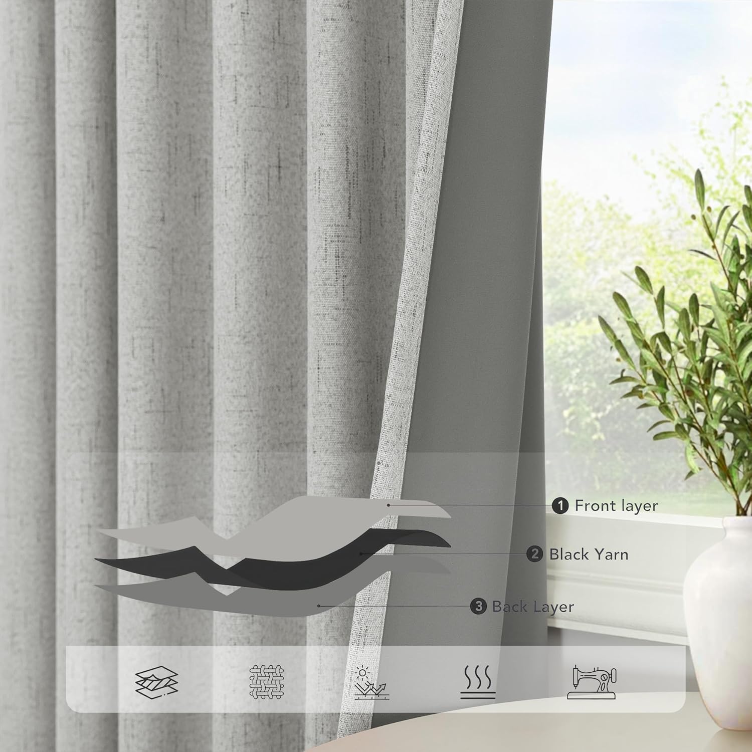 - 100% Blackout Curtains: A total blackout thermal coating layer is attached to the back of our faux linen curtains, blocking 100% of sun light and UV rays. Providing a completely dark environment for sleep and privacy. Good choice for bedroom, nursery room, kids room, living room, dining room, office, sliding glass door