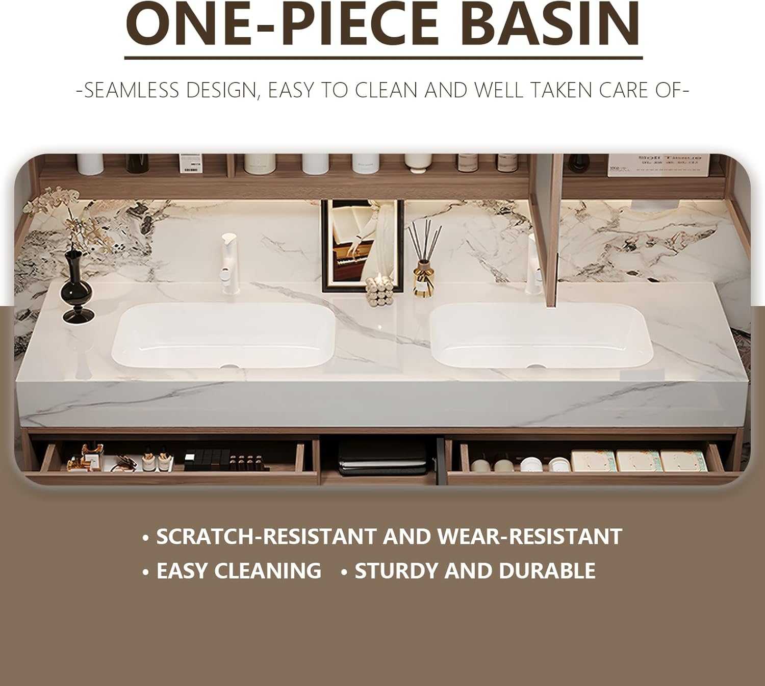 - ⭐Double Sink Integrated Washbasin: The bathroom dressing table is equipped with a large integrated ceramic double sink, with a smooth surface that is easy to clean, meeting the needs of two people using it simultaneously and improving the efficiency of morning and evening washing. It is suitable for use in family bathrooms.