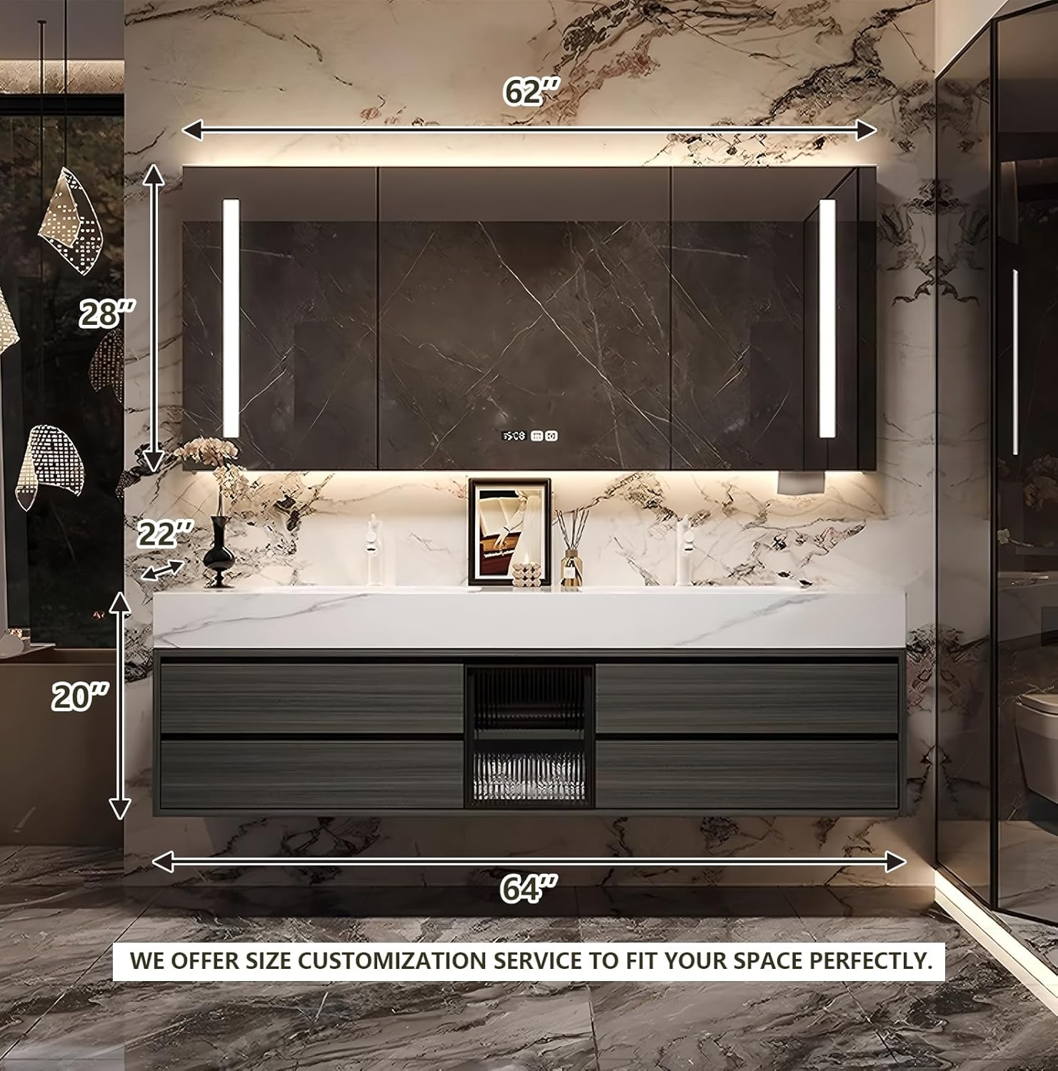 64IN Bathroom Vanity with Double Sink, Modern Bathroom Vanity with LED Smart Defog Mirror Cabinet & Integrated Ceramic Sink, Floating Vanities with Drawers and Glass Cabinet Door (Grey Wood)