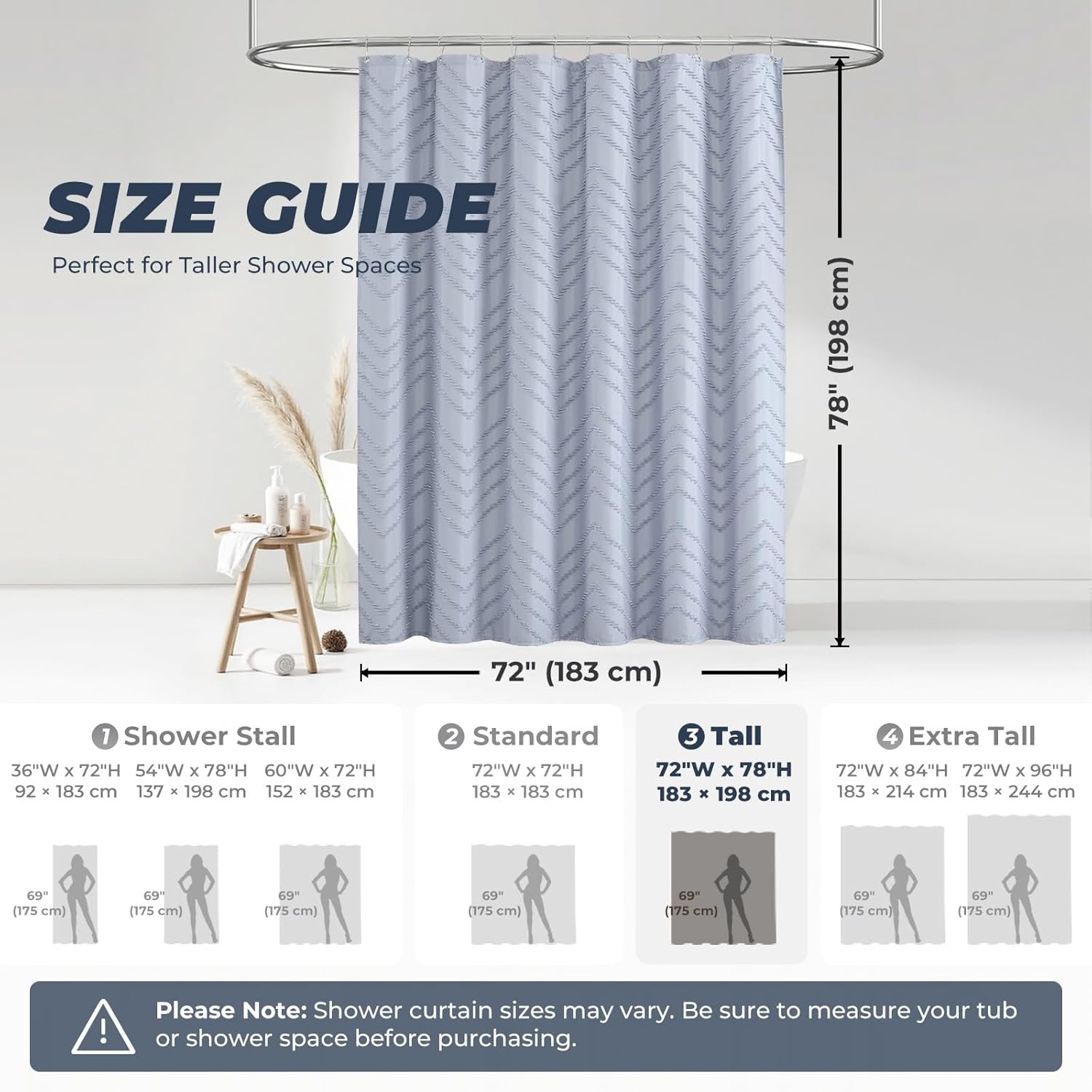 - 【Long Light Blue Shower Curtain – 72”W x 78”L with Hooks Included】 The set includes 12 plastic curtain hooks for quick setup—no liner required. The soft light blue shade adds a fresh and soothing touch, ideal for a peaceful bathroom retreat.