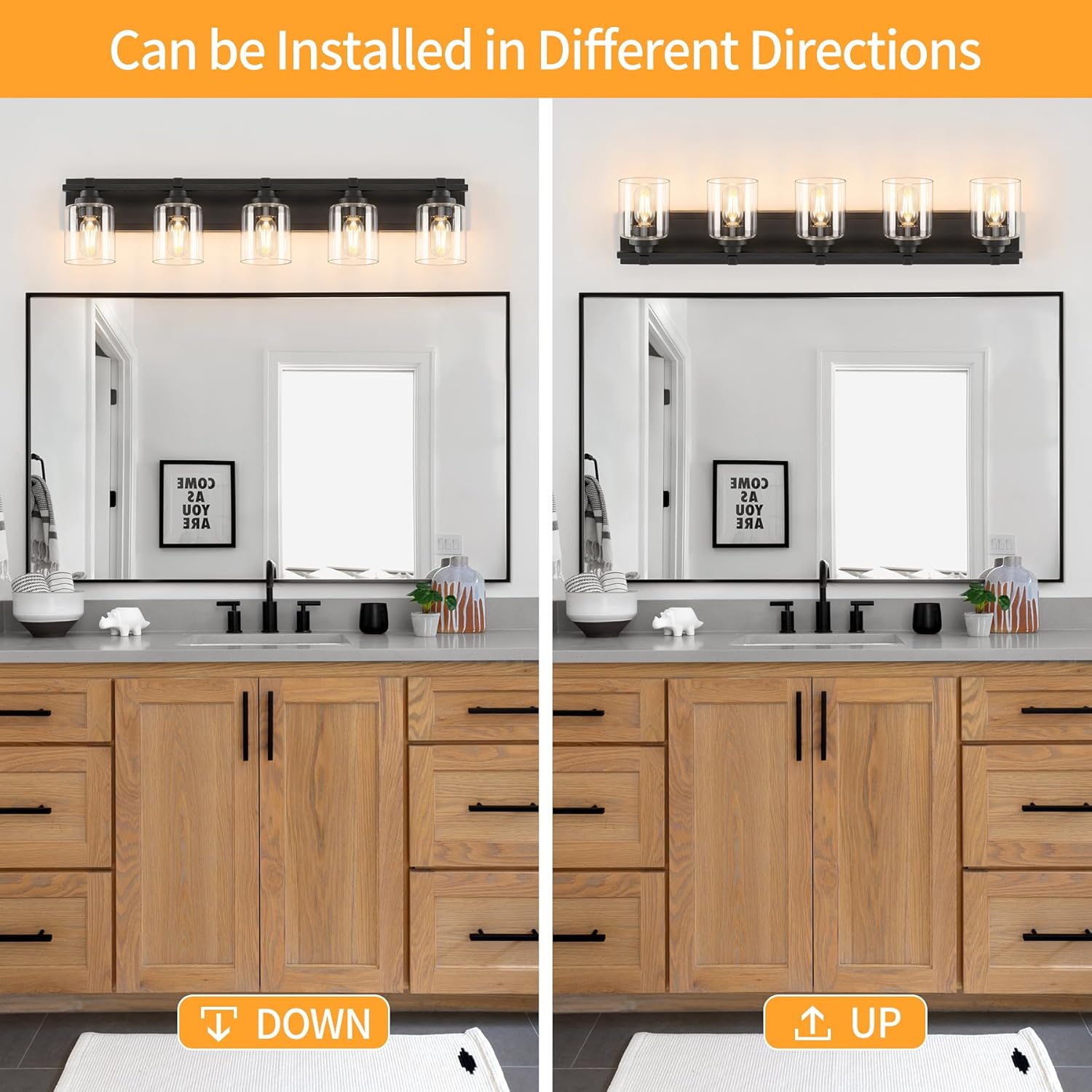 - 【Upgrade Unique Design】 The high quality metal base of black bathroom vanity lights, exudes a simple and pure beauty, reflecting a high quality texture. Combined with the clear lass shade hue, it shows a sophisticated modern style. They are also resistant to rust and corrosion, ensuring their longevity and reliability. Say goodbye to frequent replacements and enjoy the beauty of bathroom lighting fixtures for years to come.