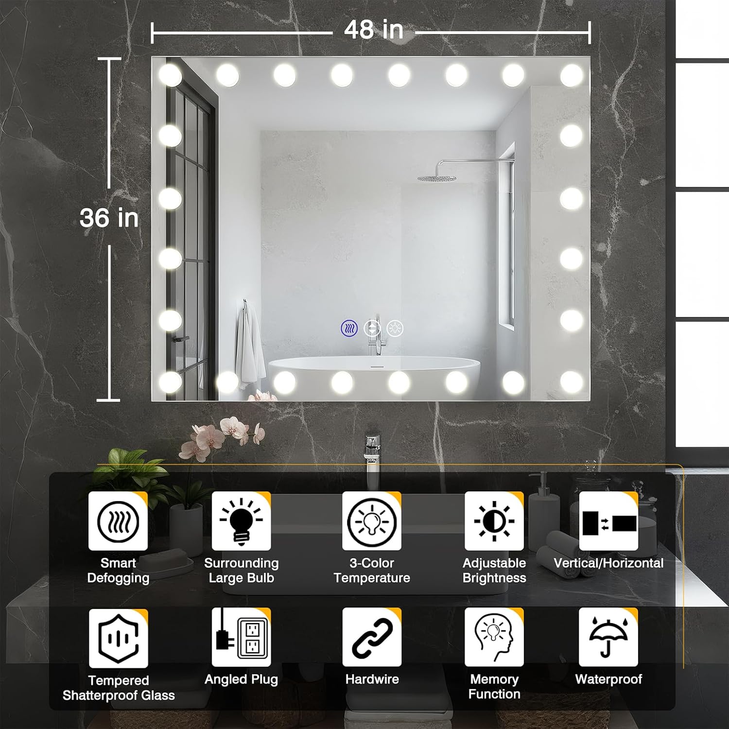 48x36 Hollywood Lighted Mirrors for Bathroom Wall, Smart Mirror for Bathroom with Dimmable LED Bulbs, 3 Color Temperatures, No Fog Mirror, Tempered Glass, Memory, Horizontal/Vertical
