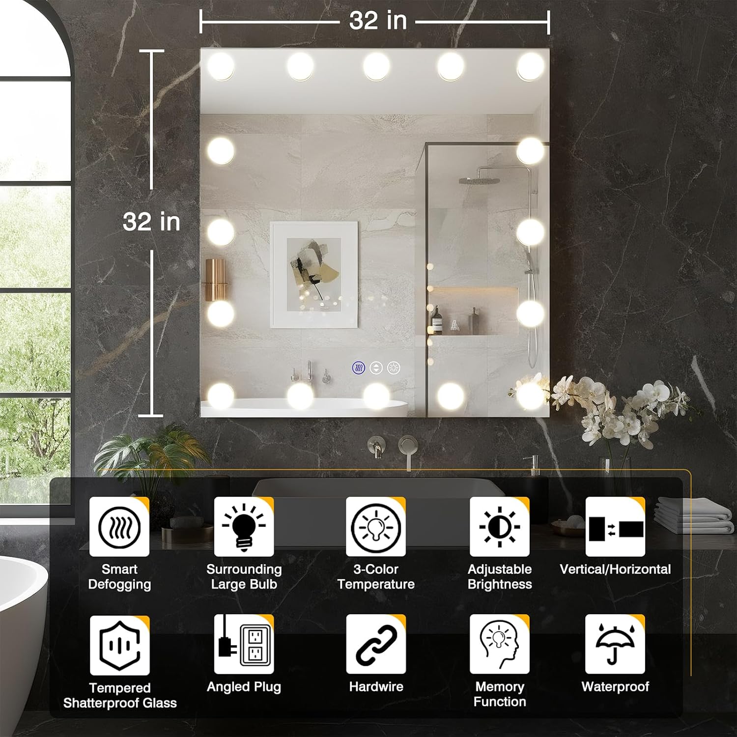 32x32 Hollywood LED Bathroom Mirror with LED Bulbs, Colors Changeable & Brightness Dimmable, Anti-Fog Mirror, Shatter-Proof, Memory, Touch Screen Mirror, Wall Mounted, Horizontal/Vertical