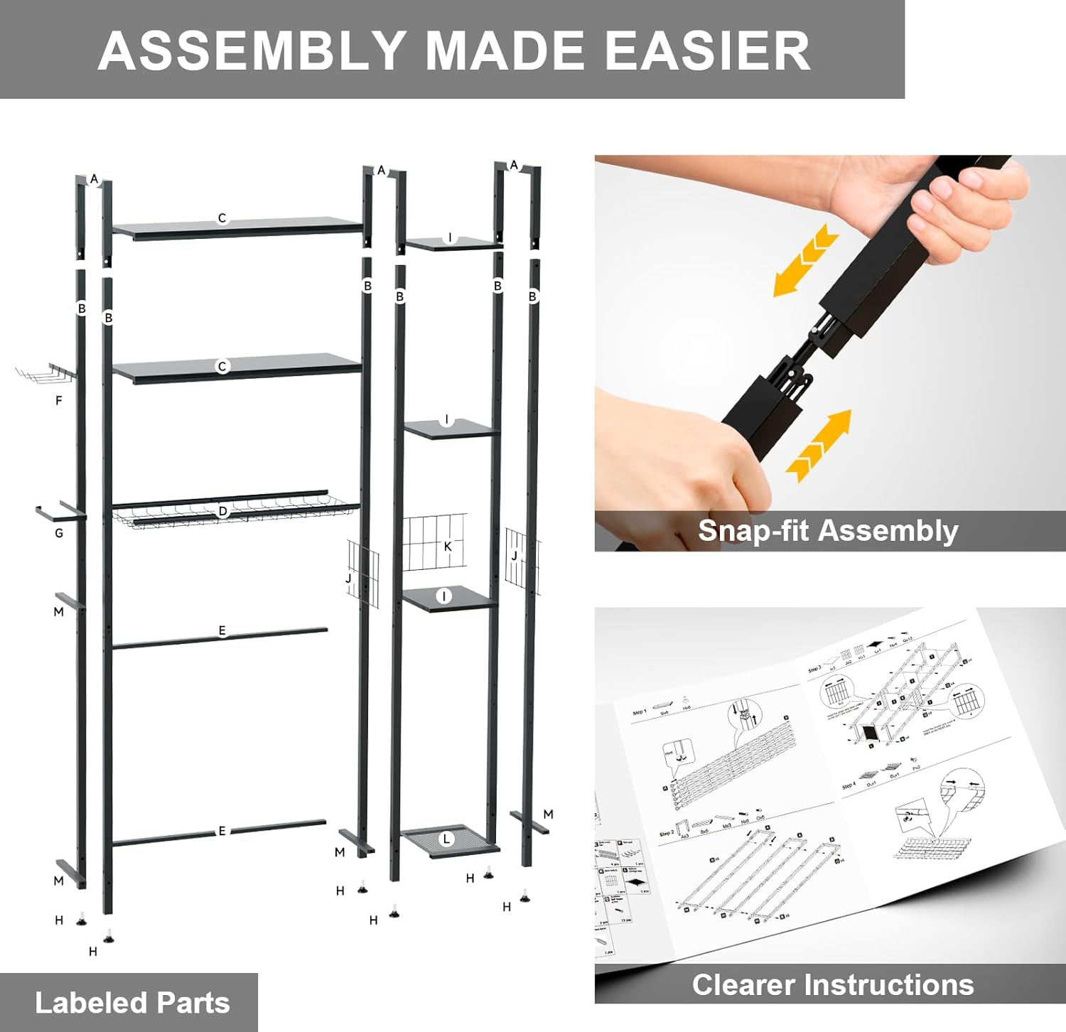 - 【ENHANCED STABILITY AND SAFETY】 : This over-the-toilet storage rack features thickened metal construction with high load capacity up to 220lb that won't wobble for regular use. The sturdy side rods, adjustable leveling feet and anti-tip kit offer extra reinforcement and balance.