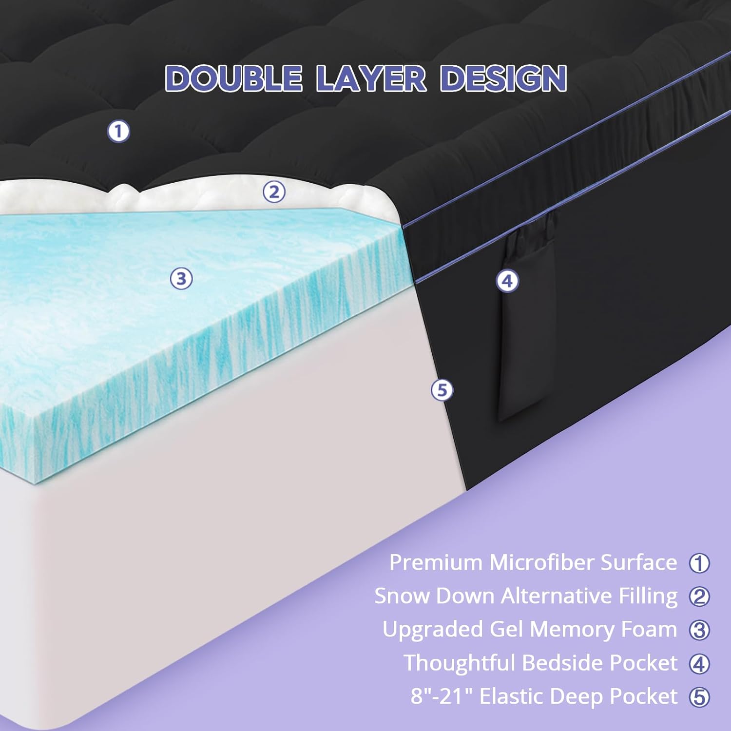ABENE Queen Dual Layer 3 Inch Memory Foam Mattress Topper, 2 Inch Gel Memory Foam Plus 1 Inch Down Alternative Pillowtop Mattress Pad Cover, Soft Black Bed Topper Support for Pressure Relief
