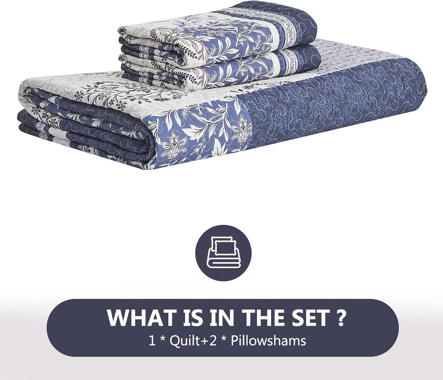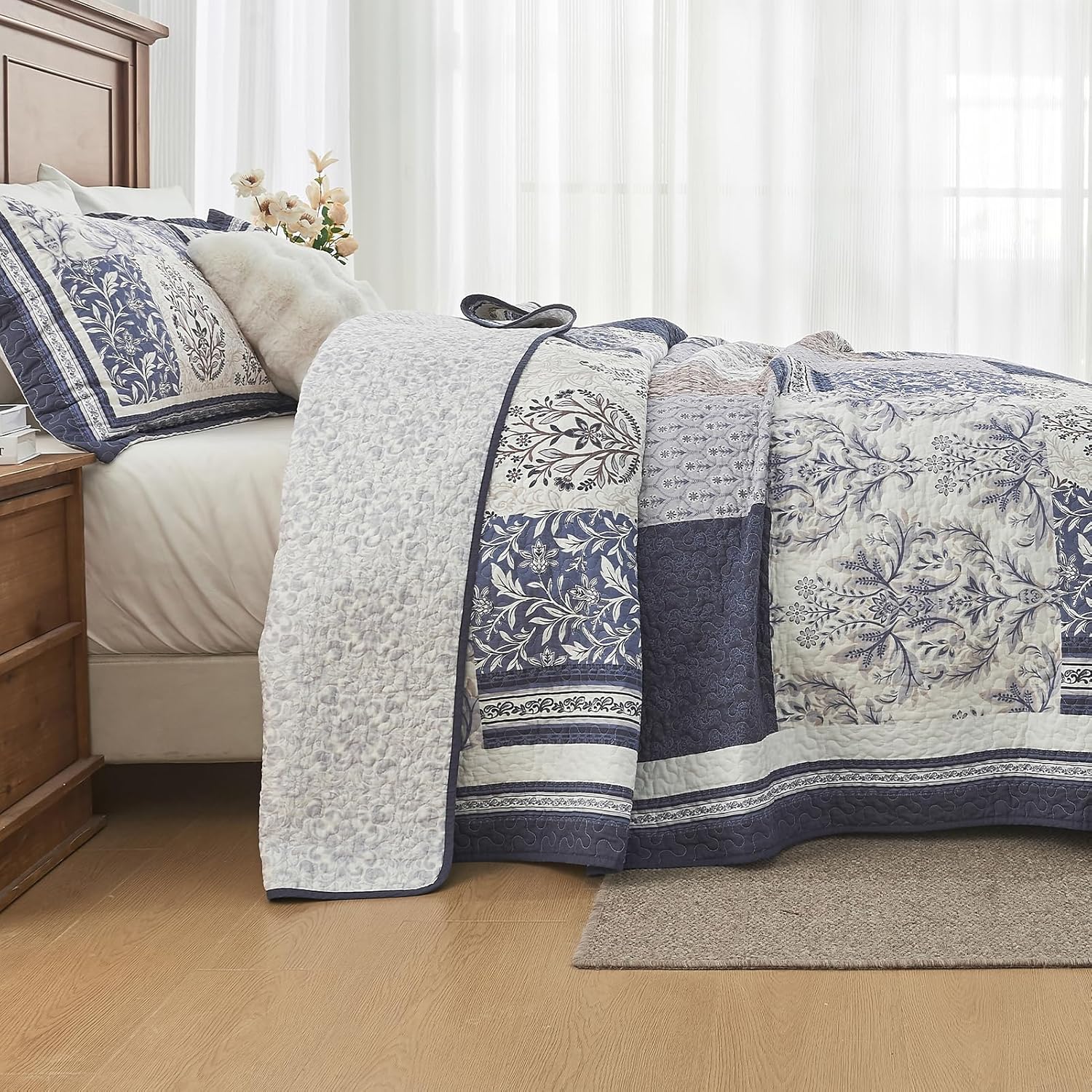 100% Cotton Quilt Set Queen Size - Floral Quilted Comforter, Patchwork Botanical Queen Quilt Bedspread, Reversible Vintage Farmhouse Lightweight Bedding for Queen Bed, 3pcs, Blue/Beige