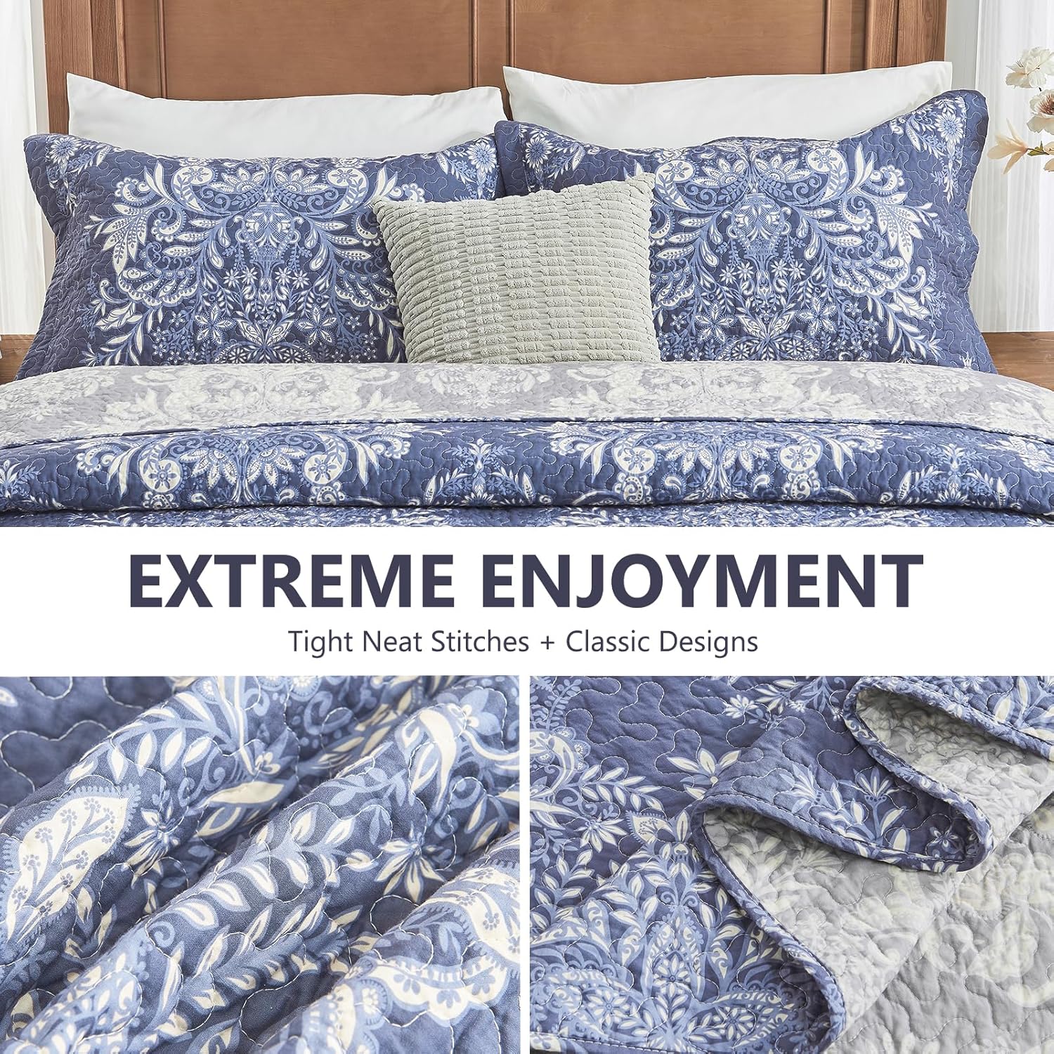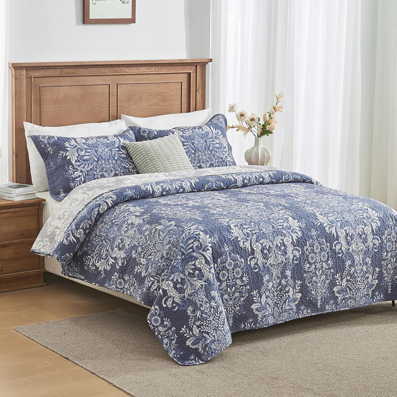 100% Cotton Quilt Set Queen Size - Damask Pattern Quilted Comforter, Vintage Reversible Queen Quilt Bedspread, Lightweight Bedding for Queen Bed, 3pcs, Blue