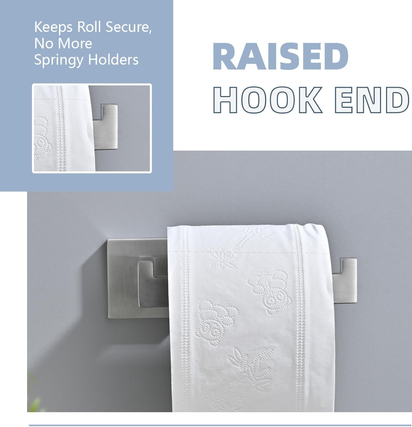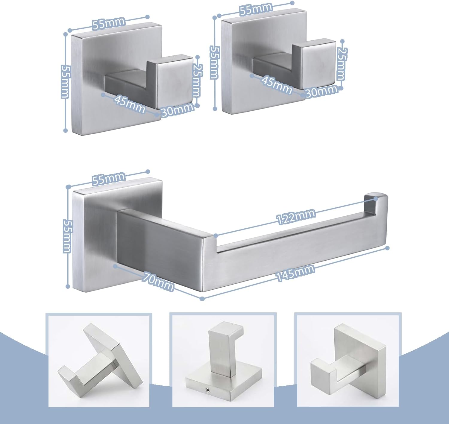 - Versatile Functionality & Placement: The wall-mounted toilet paper holder and square robe hooks provide practical storage solutions for towels, robes, keys, and more. Install them in bathrooms, kitchens, garages, or laundry rooms to maximize space and keep items organized